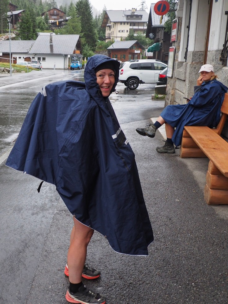 On day 1 of Tour du Mont Blanc, we (Anne, Mark, Rob, Ben, John and I) took a bus up the hairpin bends from Orsieres to Champex Lac then bought some butties and started the 11-day trek. It was raining when we started hiking, but it stopped after about an hour and we took our waterproofs off. The others found my poncho amusing but it worked well for me. It kept me dry, without being sweaty.