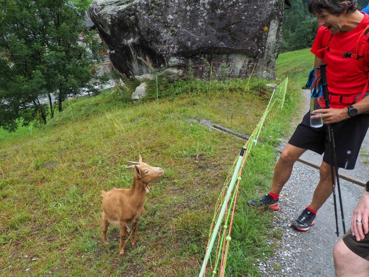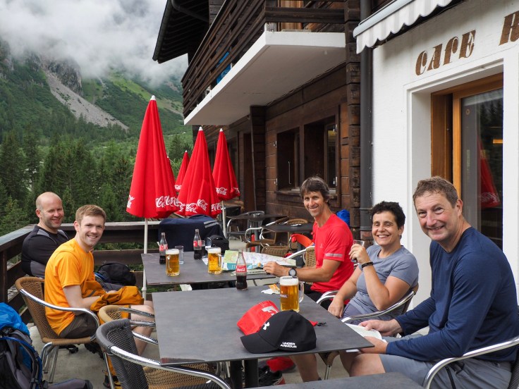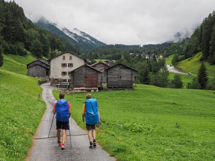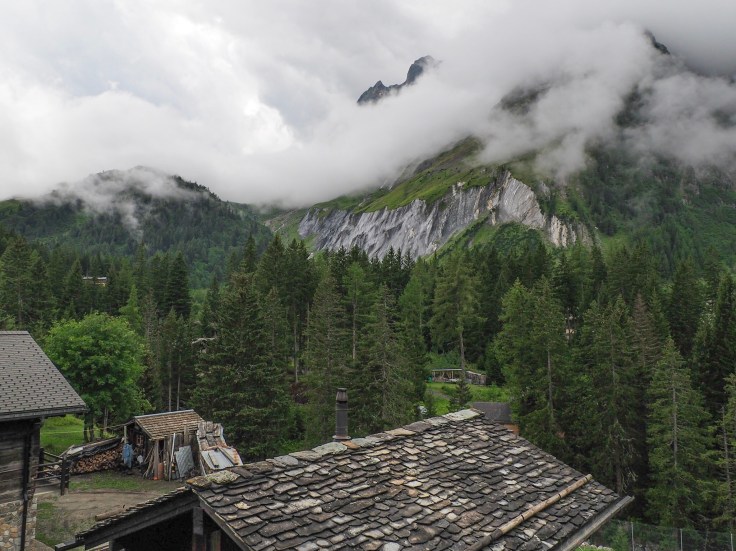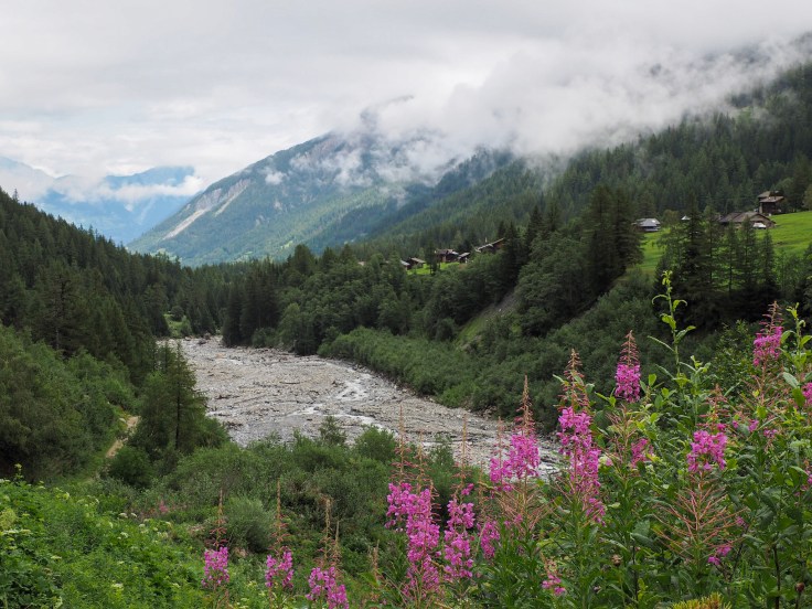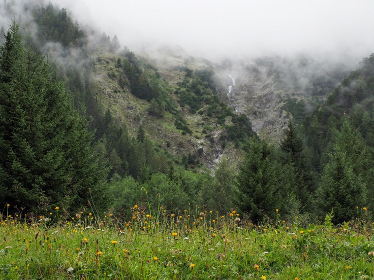 We walked along the Sentier de Champignons though the forest, then passed through pastures and Praz de Fort (a beautiful hamlet) to La Fouly, where we stopped for beer before walking the last couple of kilometres to Hotel du Col de Fenetre. The scenery was stunning even though the cloud was low all day.