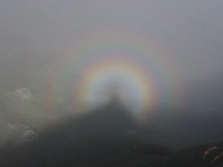 John and I were pleased to see our first Brocken spectres, with the sun projecting our shadows on to the mist in the valley, and halos around them. Fab!