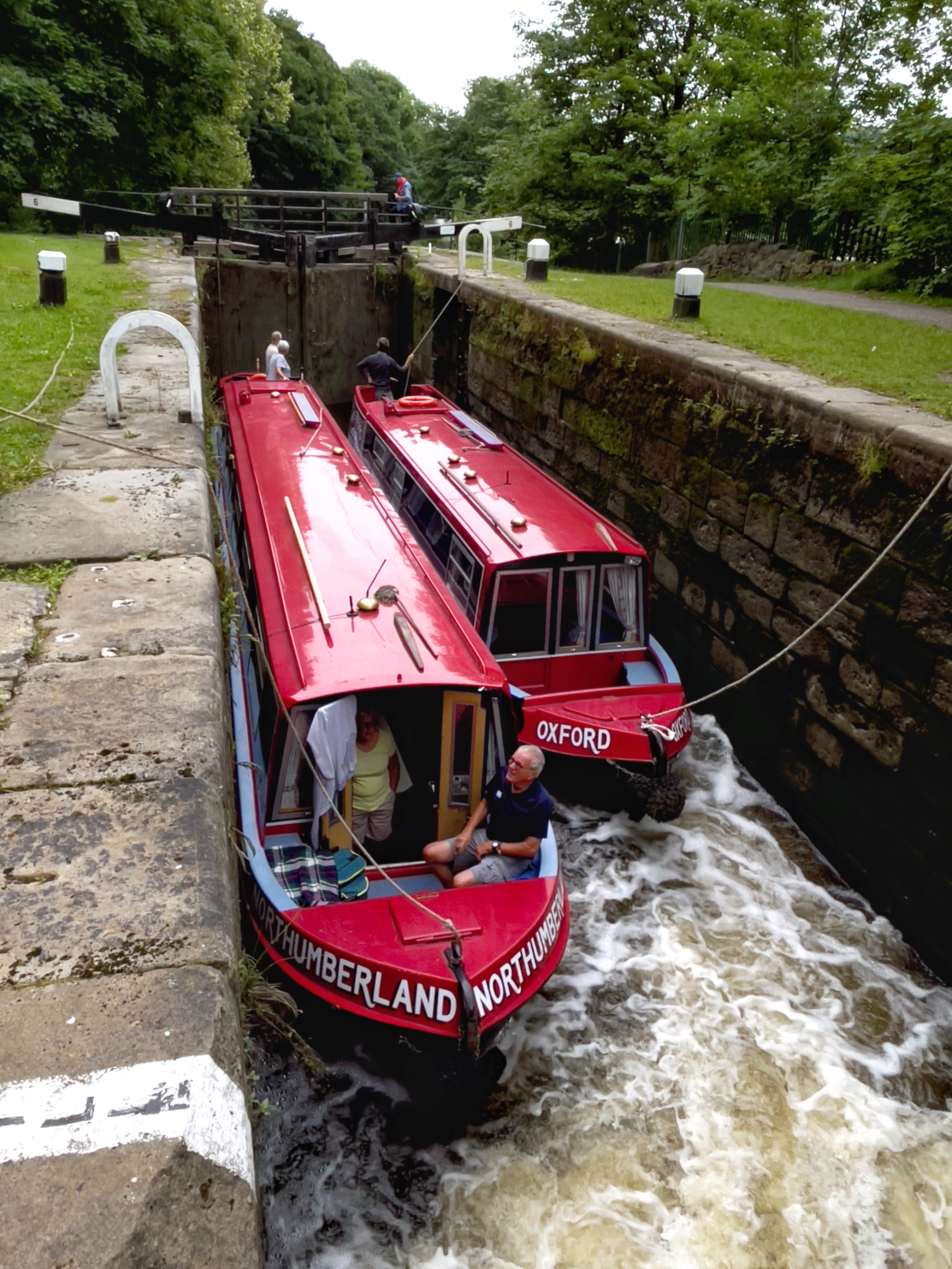 Next we entered a procession of narrow boats heading up the canal for some practical instruction. In pairs, we approached the first lock and were shown what to do… open the bottom paddles to let the water out; open the bottom gates to let the boat in; close the bottom gates and paddles; open the top paddles to let water in and raise the boat; open the top gates to let the boat out; then close the top gates and paddles…. And don’t forget your key and windlass. Phew!