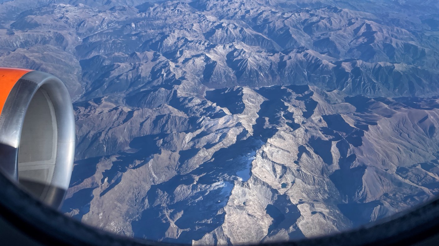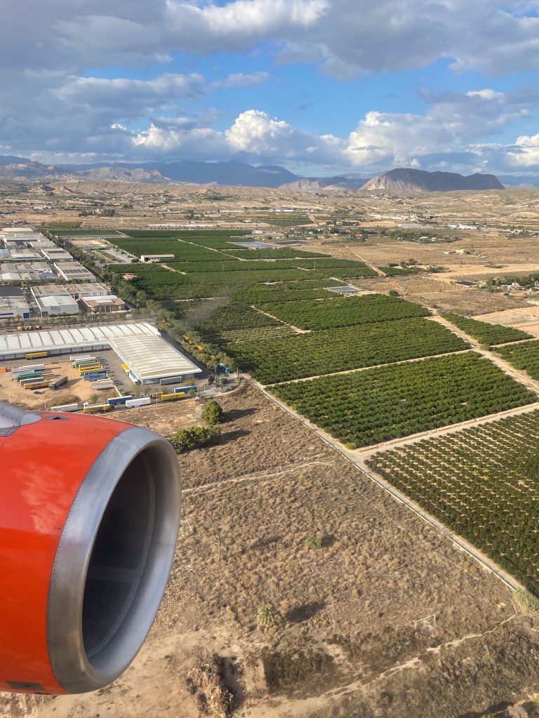 The flight went well and two and a half hours passed quickly. As we watched a couple of episodes of Chernobyl, the landscape changed from cloudy UK, to sunny green France, the mountains of the Pyrenees, then the dryer landscape of Spain. Despite horror stories in the media, we quickly went through passport then health controls in Alicante airport and, as we were waiting for our baggage, I received texts from both our hosts, David and Tiffany, to say David would meet us outside. When we left the airport building, we were delighted to see how hot and sunny it was!