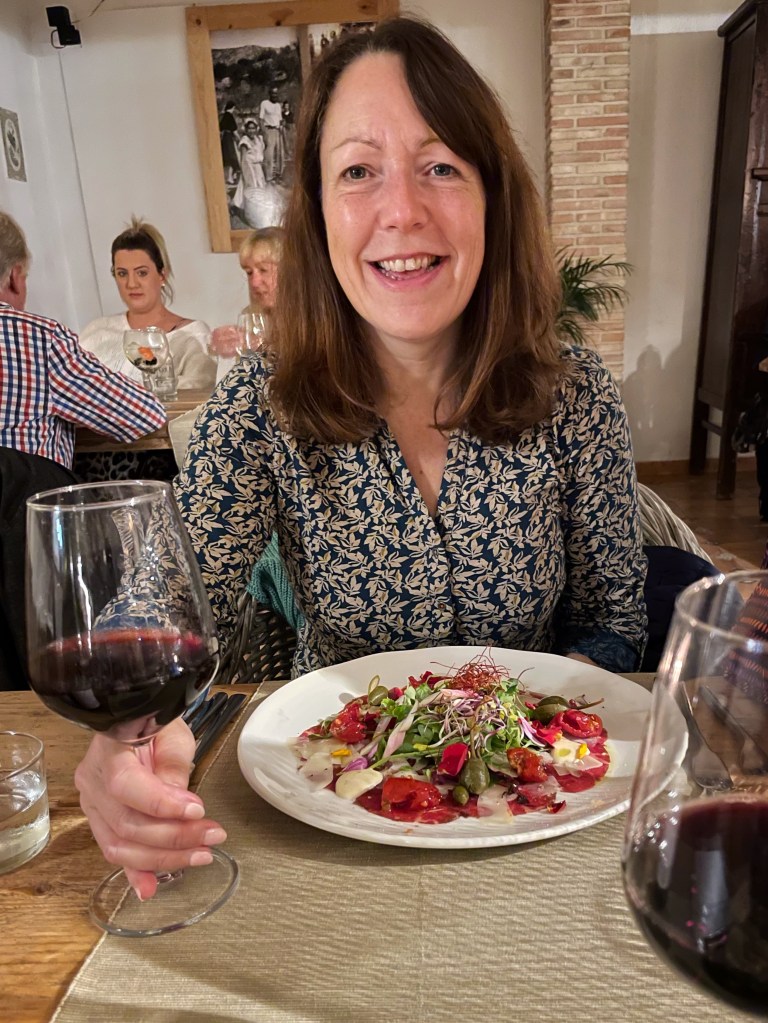 By now, it was pretty dark, as we walked downhill to the restaurant. We were surprised to be greeted in English by the waitress, and at the number of English-speaking people inside. The food was delicious. I had wagu beef carpaccio followed by sea bass, and John had salchichon followed by a big hunk of Iberico pork… and of course we had a bottle of delicious local wine and desserts!