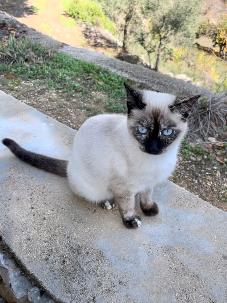 John and I were surprised when the waiter brought over some bread and tapas to start with, then a mixed salad, before the main course was served. Everything was delicious, especially eaten in the sunshine, looking over the valley, chatting to Dave and Tiffany, and being entertained by two young cats who were playing under the trees. Just perfect!