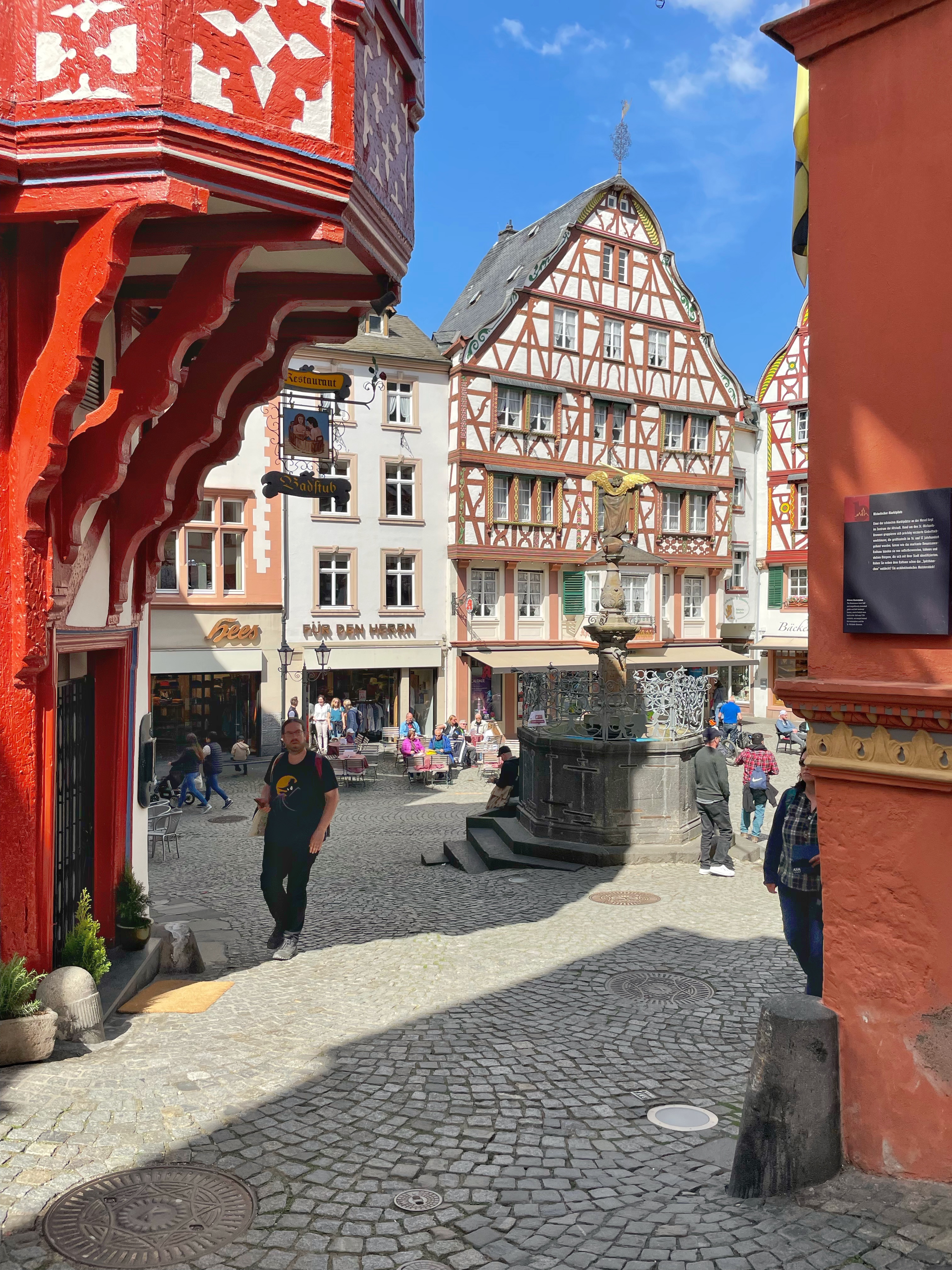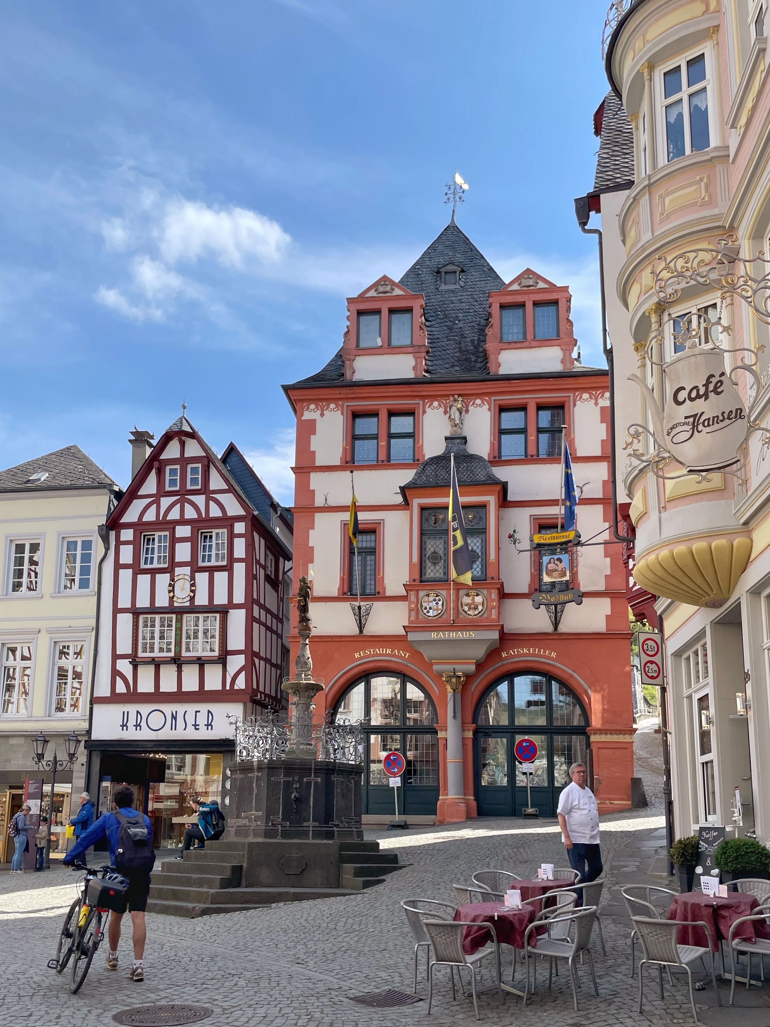 We crossed the Mosel, looking up at the remains of Burg Landshut on the hill, and down on the ships on the river. As we walked up to the old marketplace, the first gabled timber framed building we saw was the Rathaus (town hall).