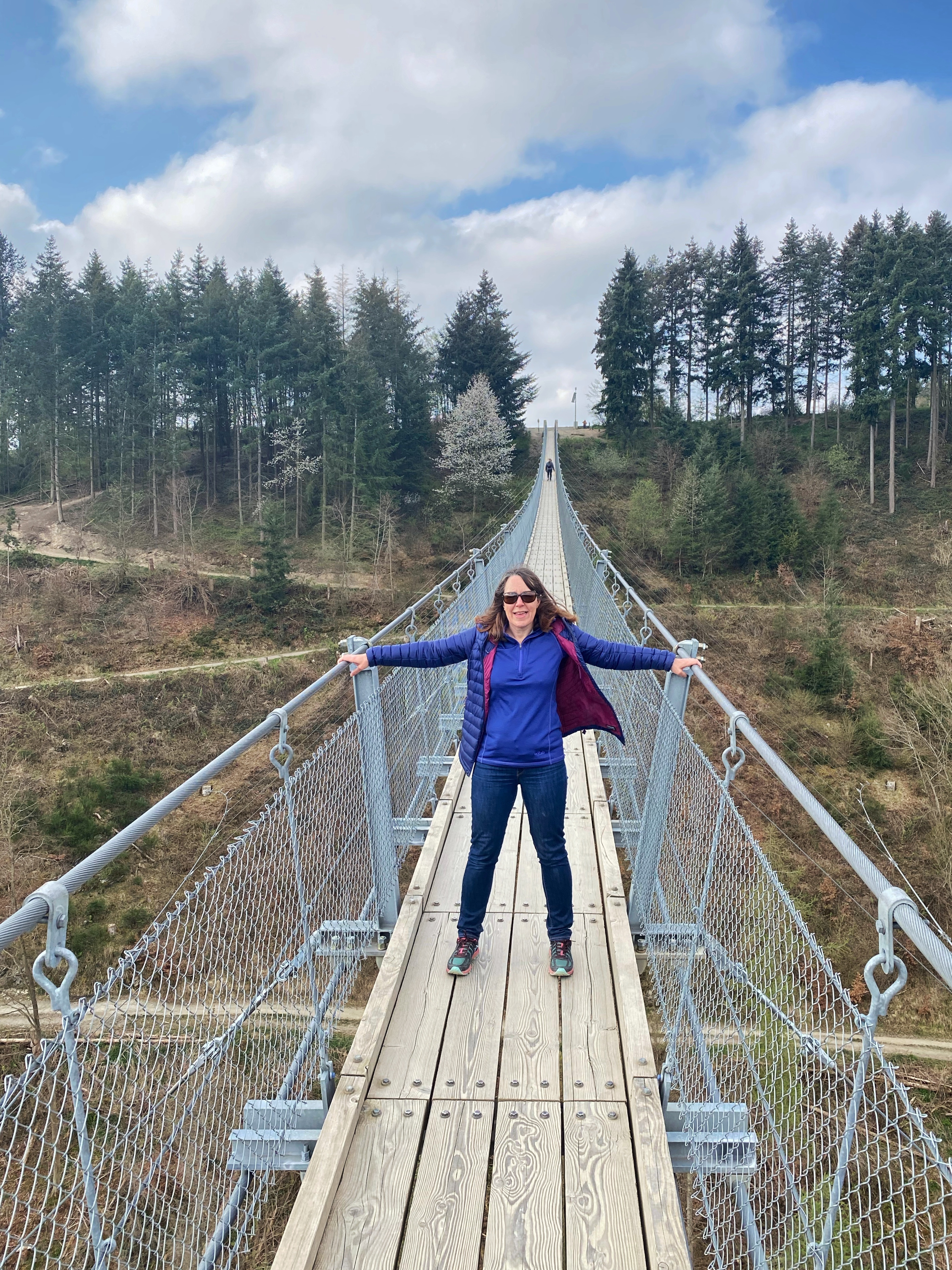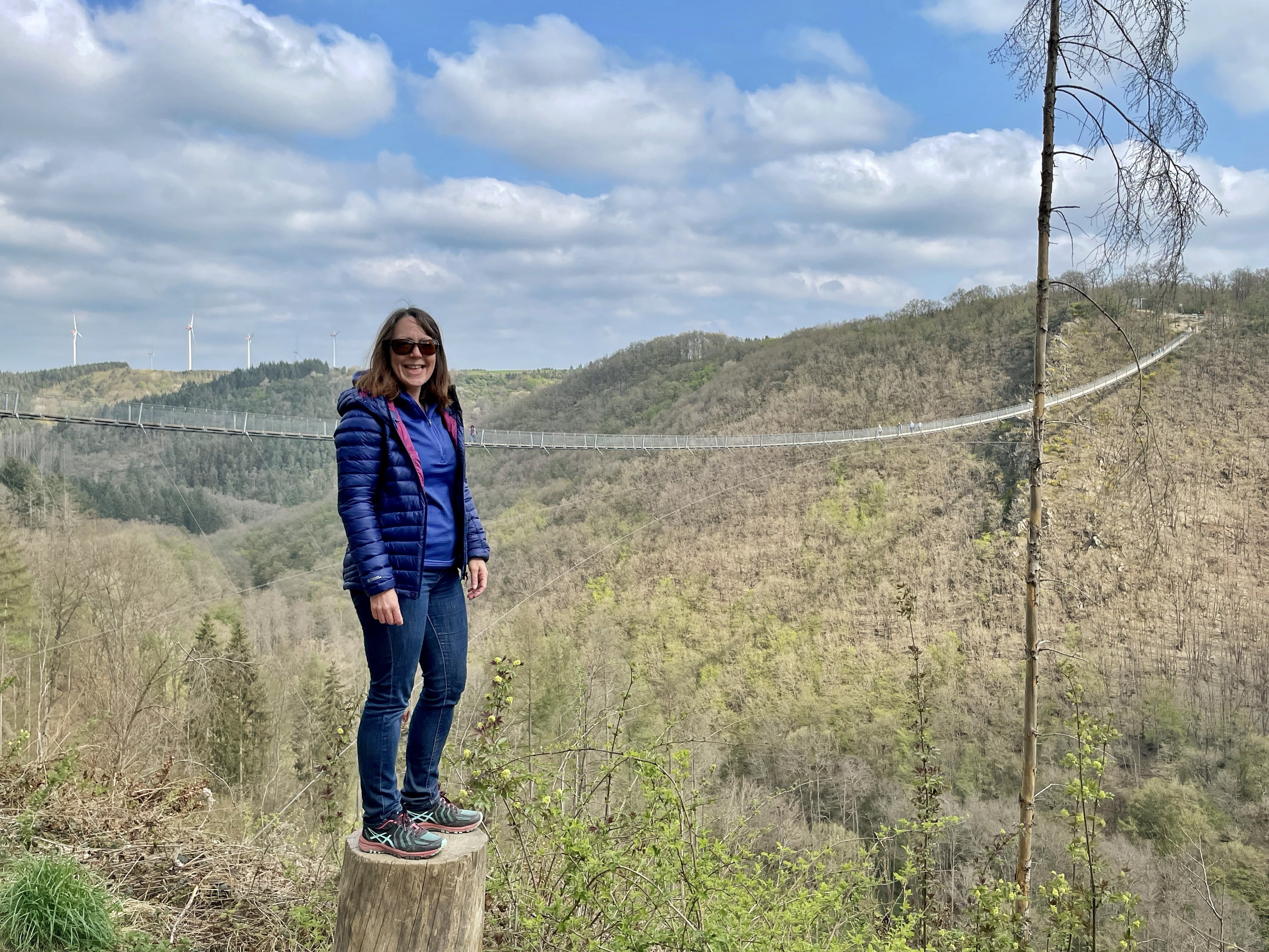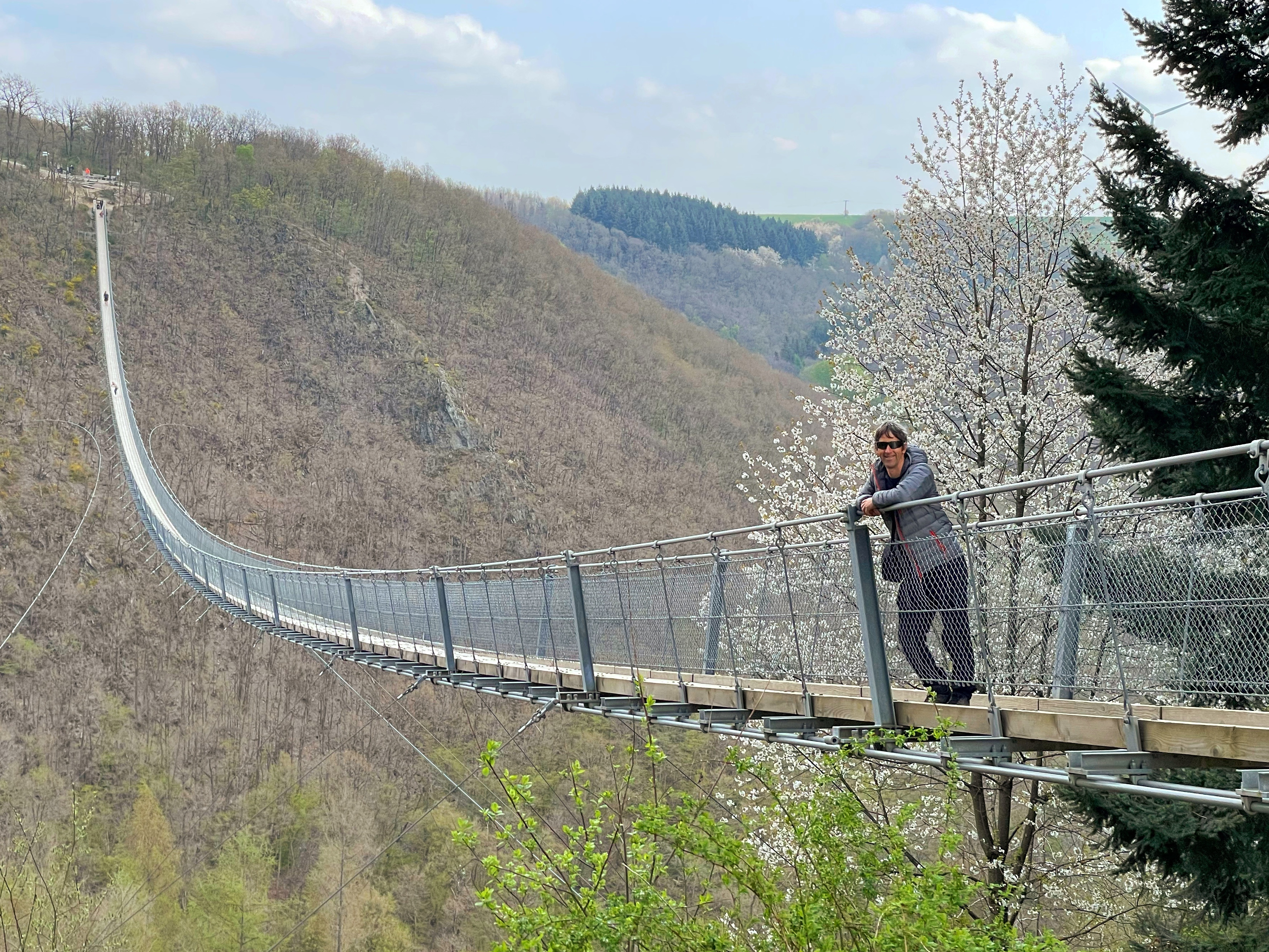 After a lovely peaceful sleep at Bernkastel-Kues, we drove to visit Geirelay suspension bridge. We were both looking forward to this, although I was a bit apprehensive about it. The bridge has a span range of 360 metres (1180 ft) and is up to 100 metres (330 ft) above the ground. We’ve crossed shorter ones in the Alps before and they’ve been very wobbly, so I thought this one might sway a lot!