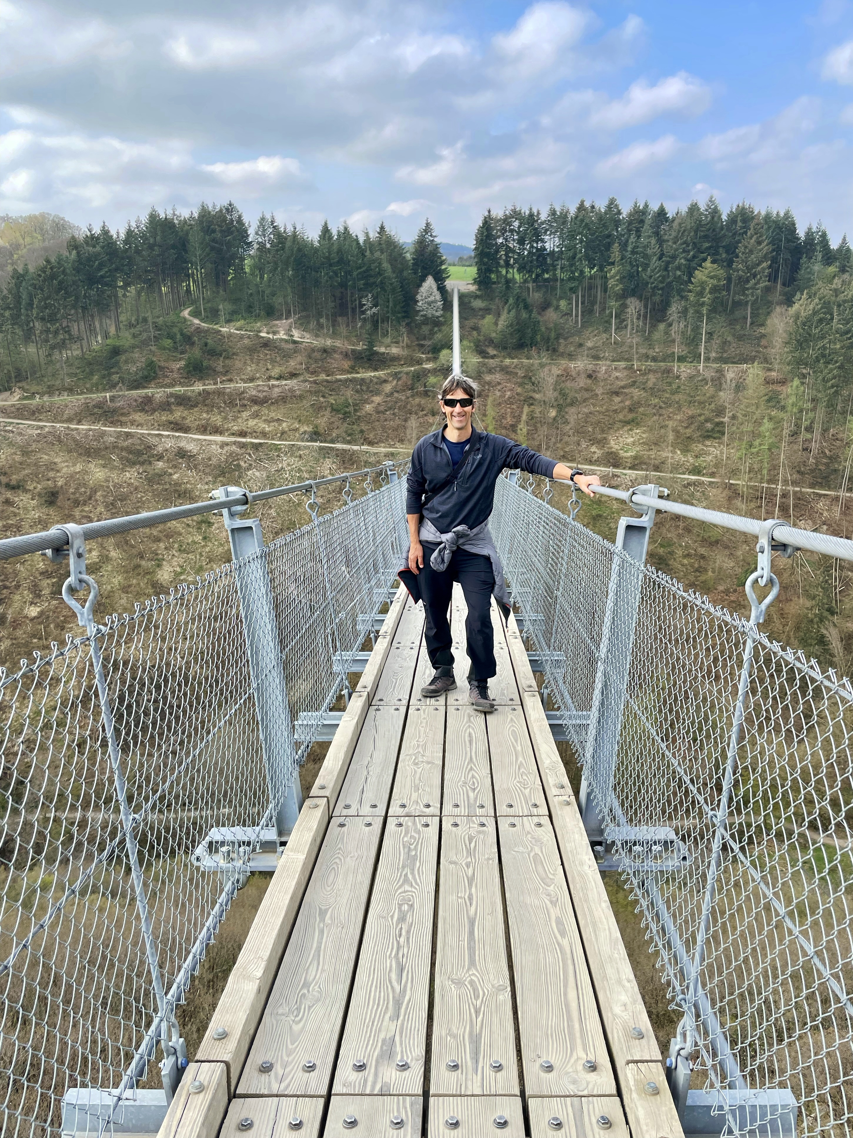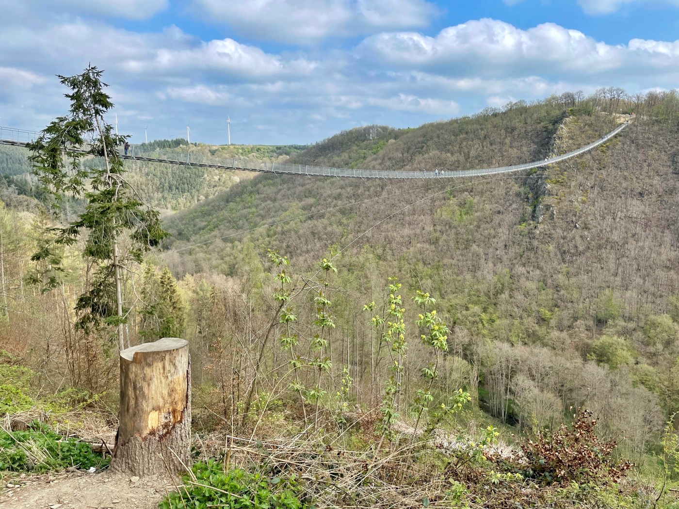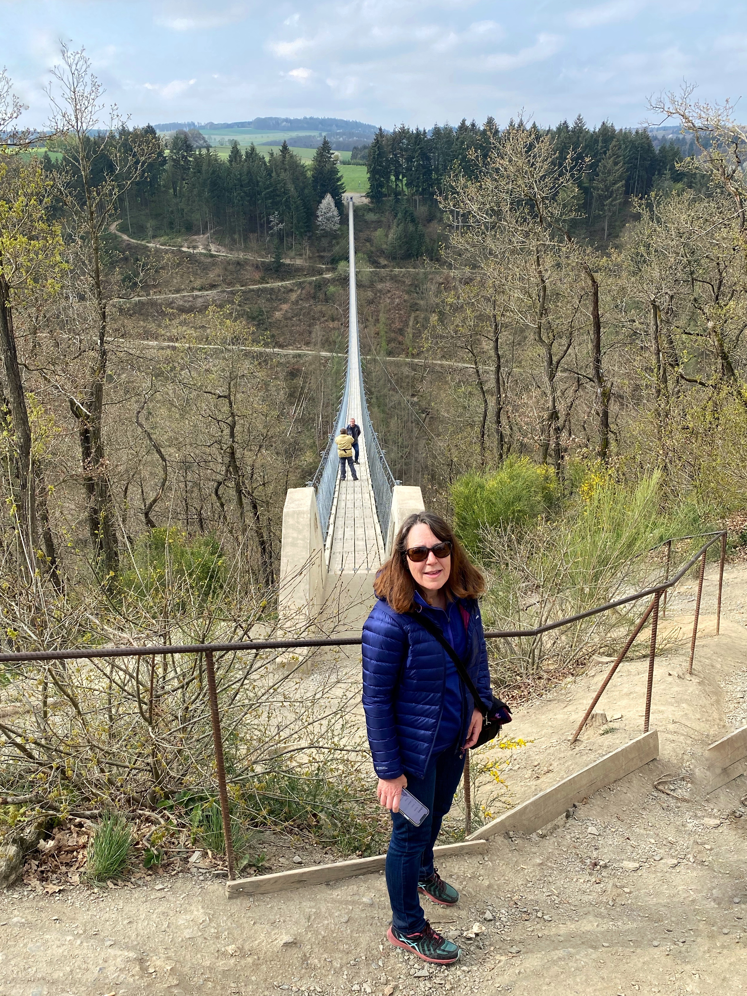 After a lovely peaceful sleep at Bernkastel-Kues, we drove to visit Geirelay suspension bridge. We were both looking forward to this, although I was a bit apprehensive about it. The bridge has a span range of 360 metres (1180 ft) and is up to 100 metres (330 ft) above the ground. We’ve crossed shorter ones in the Alps before and they’ve been very wobbly, so I thought this one might sway a lot!