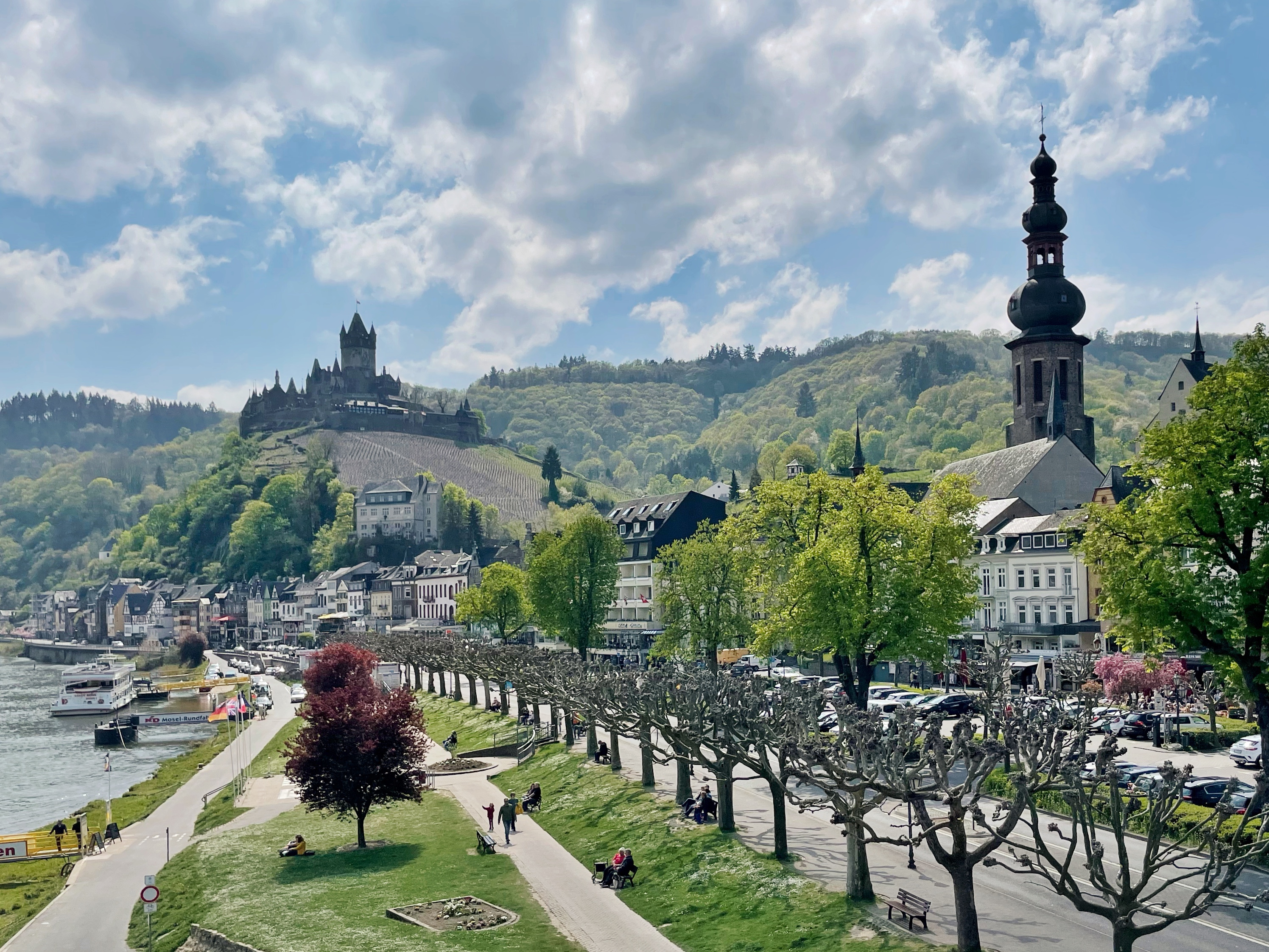 After this, we drove to Cochem, another town with a castle and lots of pretty timbered buildings. This was to be the last stop on our trip. The motorhome parking area was very busy but we managed to find a space for Bertie beside the Mosel. Unfortunately, it was also by the main road and railway, which would later lead to a disturbed night!