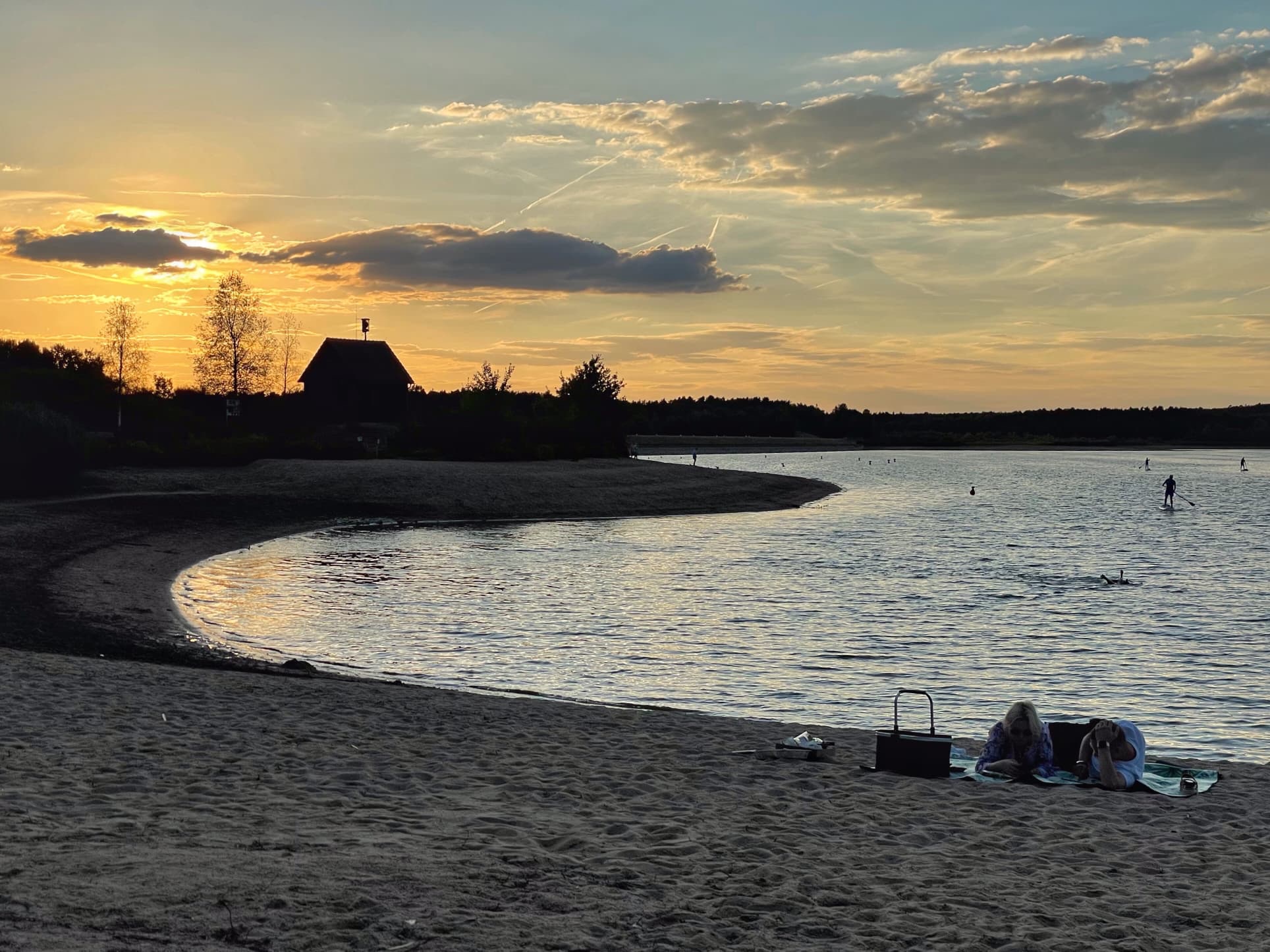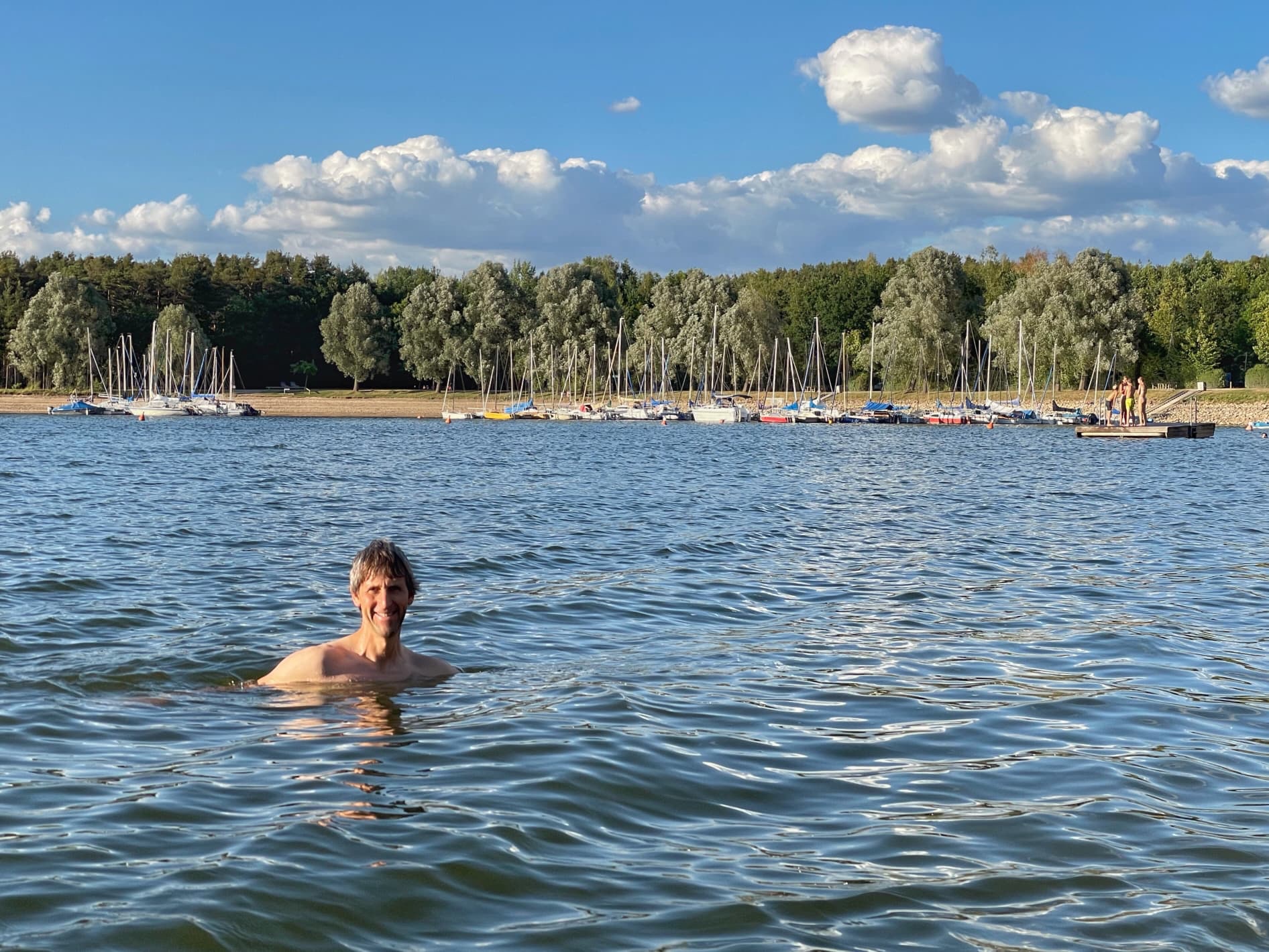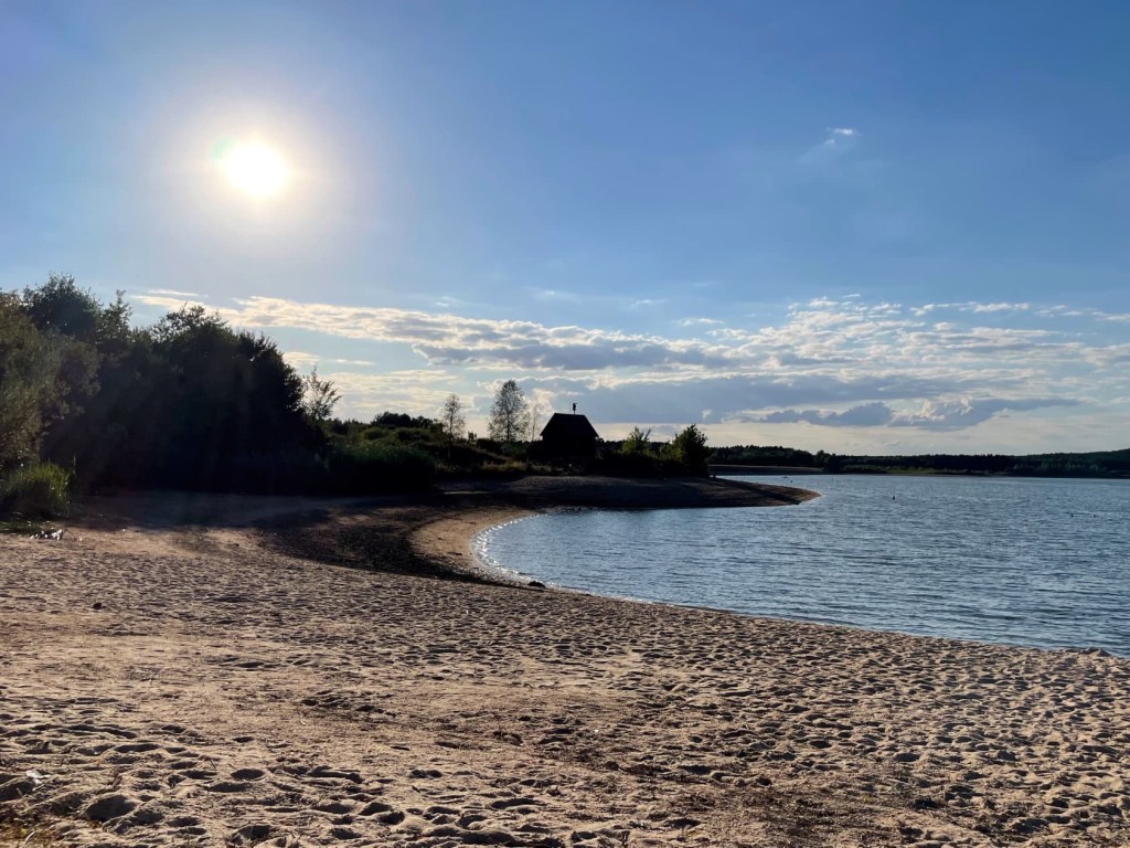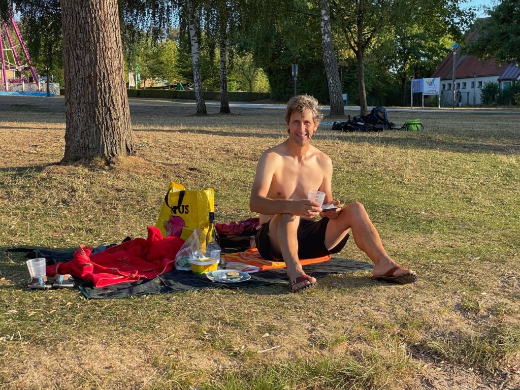 We’re staying in a lovely stellplatz costing just 8 euros. It’s situated on a swimming lake and, although we drove through rain for much of the day, the weather is now glorious. We had planned to eat out as it’s been such a long day but the restaurant was closed when we arrived. Not to worry… after a swim in the lake, which was lovely and warm, we had cheese and wine, sitting on the picnic blanket, watching the sunset.. Just perfect! Finally relaxing… our holiday has begun!