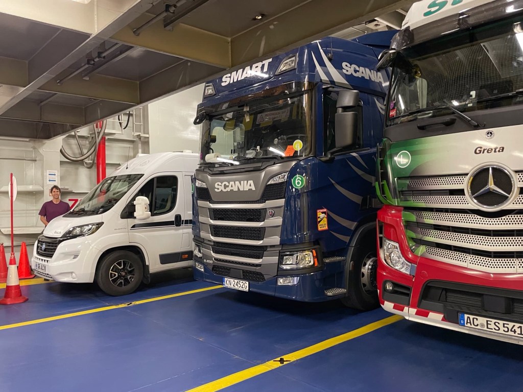 I tossed and turned all night on the ferry, finally giving up trying to sleep at 4.30. At 5.30 an announcement came over the tannoy that the restaurant was open for breakfast so we rose and tried to shine. Then it was time to go back to Bertie and disembark.