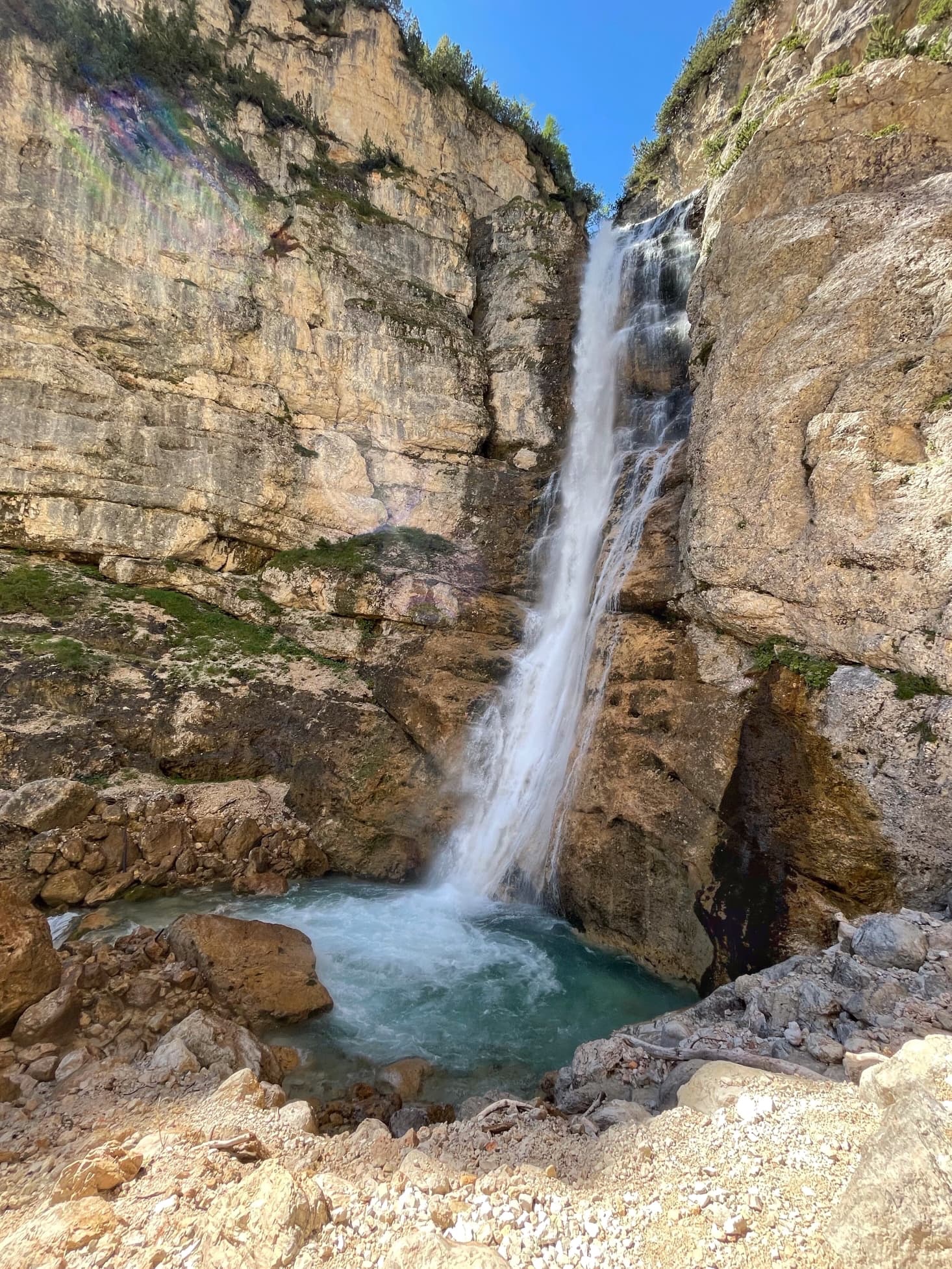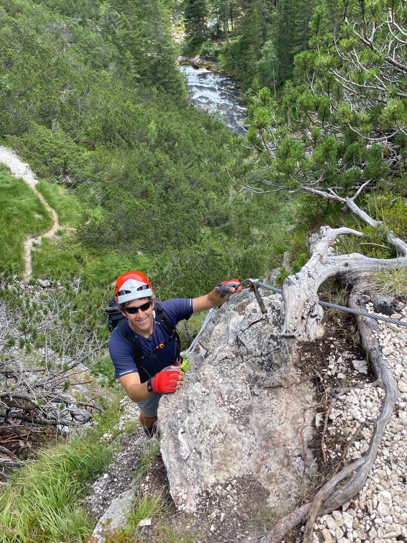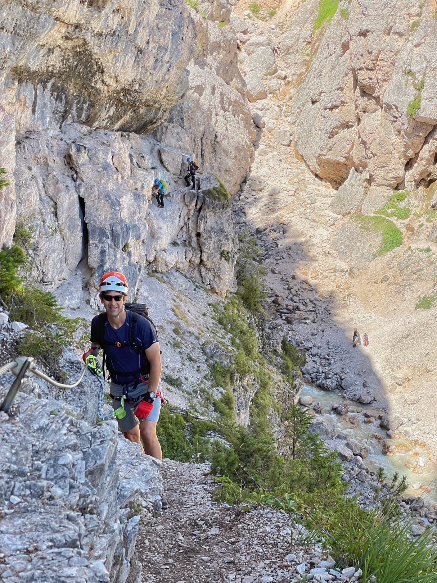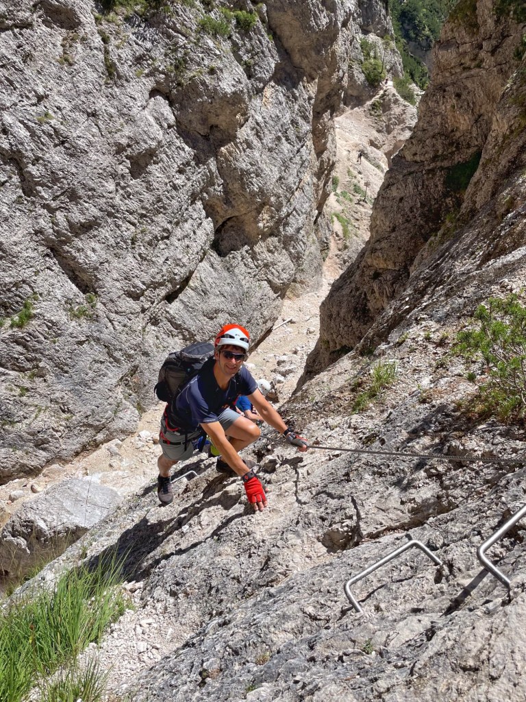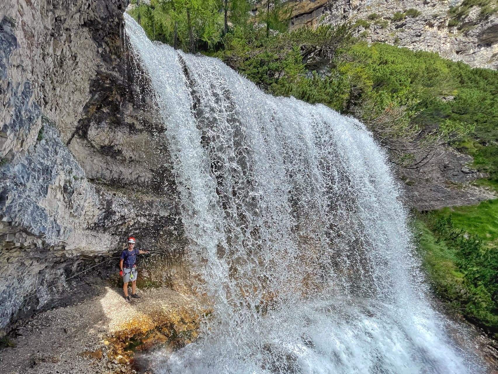 We scrambled over boulders following a stream to reach another waterfall, tumbling down the cliff. After crossing the river, we started Ferrata Lucio Delaiti.