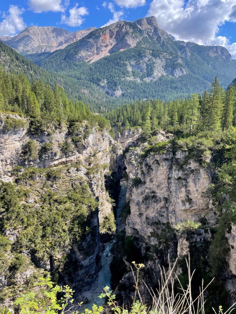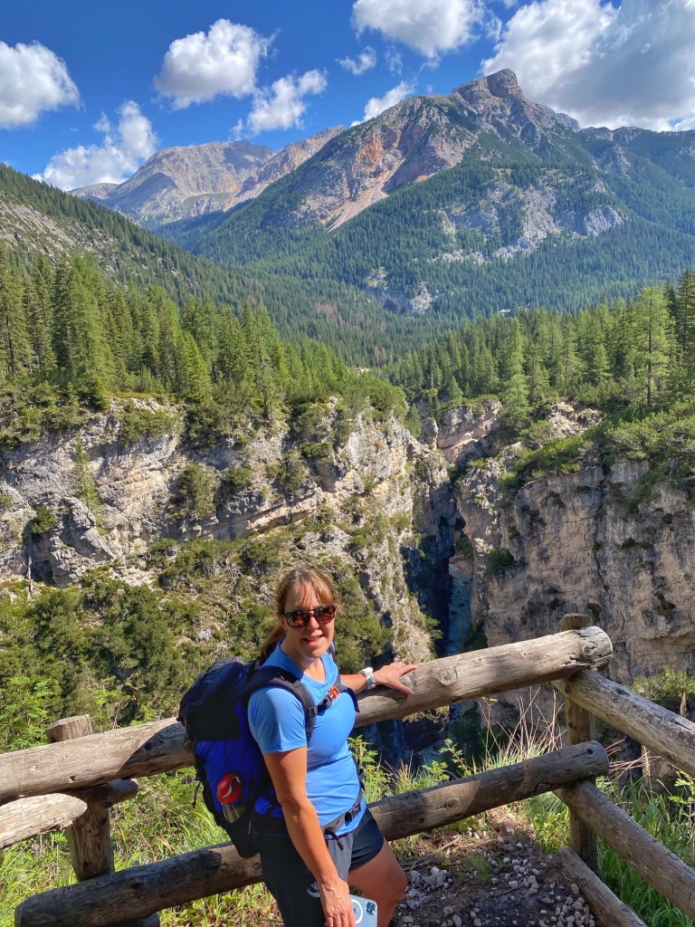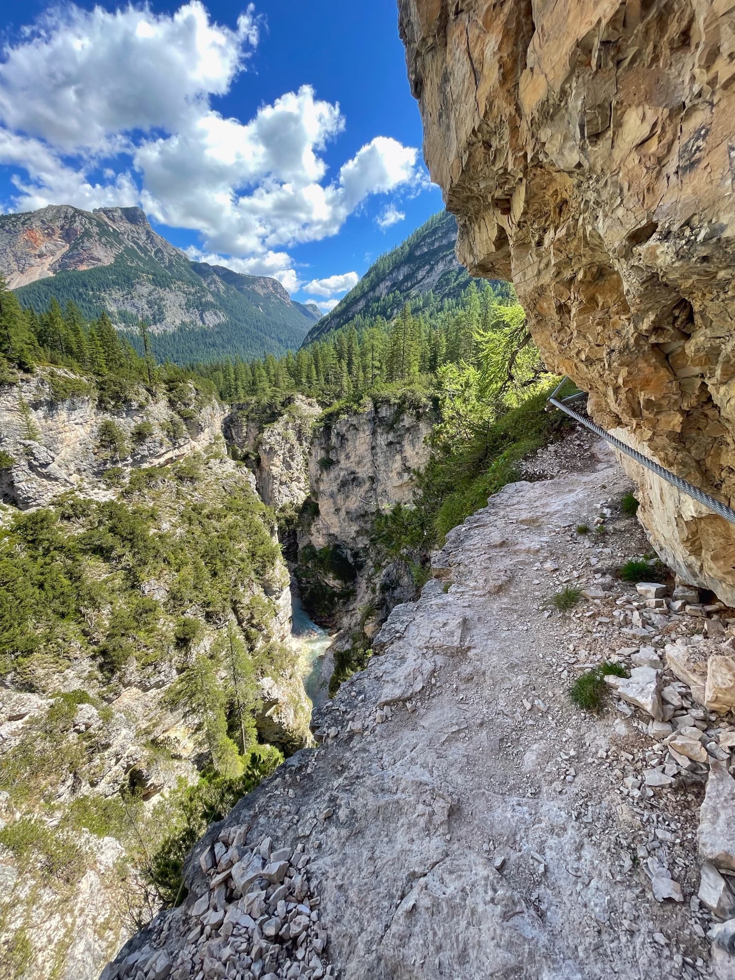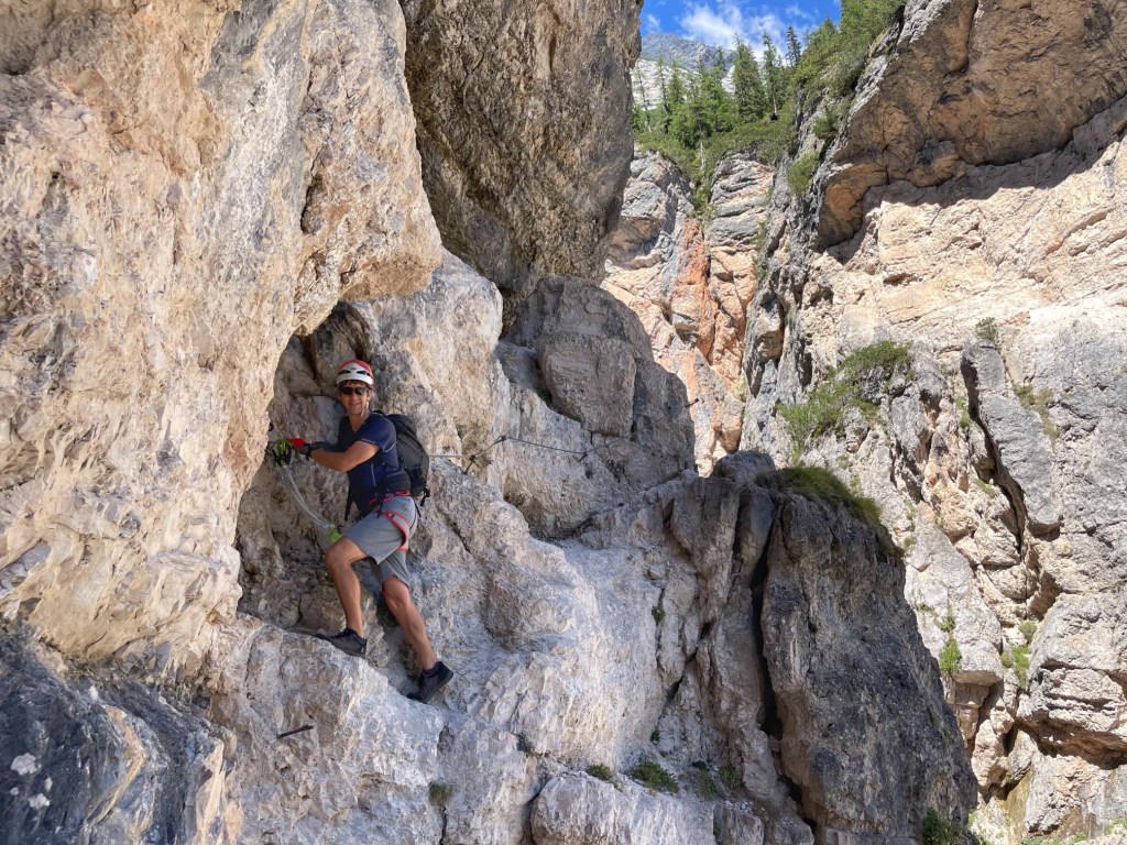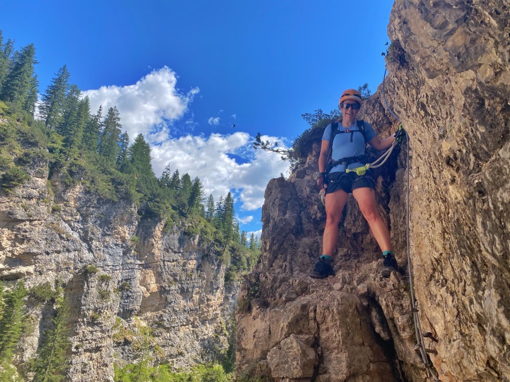 We followed the path uphill for sometime, following signs for Cascata Di Fanes, until we reached a spot in the woods where Ferrata Giovanni Barbara began. There were lots of other people getting their via ferrata kit on, and we did the same.