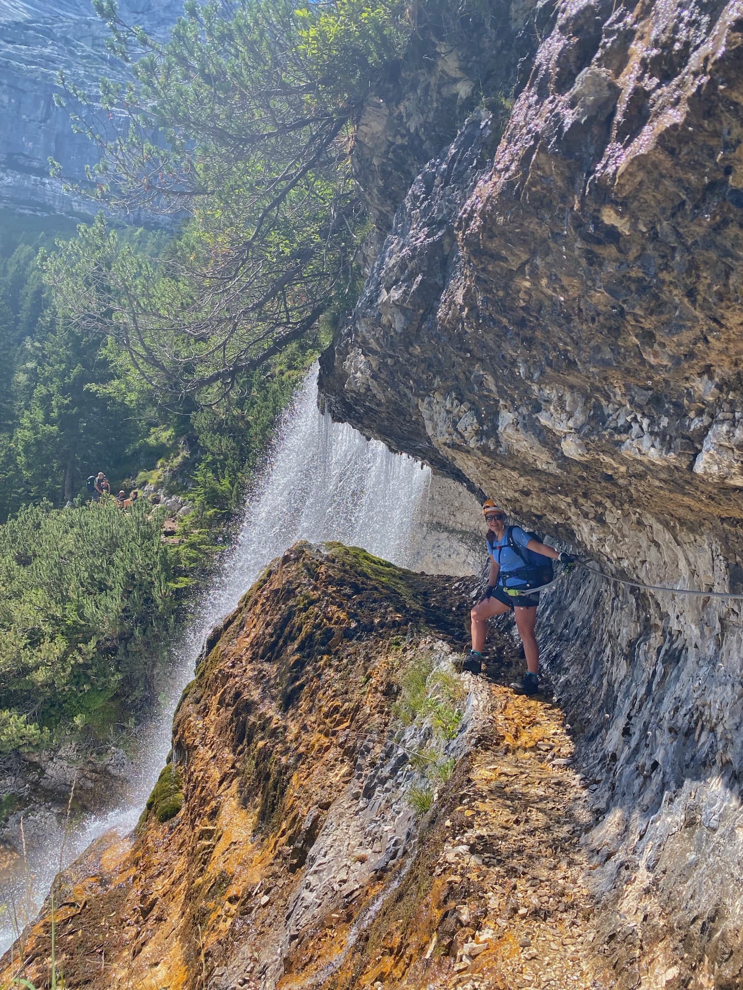 The path started along a ridge before dropping down and passing behind a waterfall. We didn’t need to clip onto the iron cables at this point because the path was wide. After this though, the path became steeper and rockier and the cables were helpful for reassurance in case we fell. That said, both of us were happy on the route, in fact, I was pleased not to be the wimp holding everyone up!