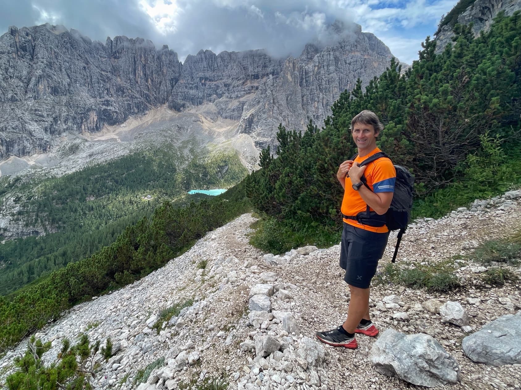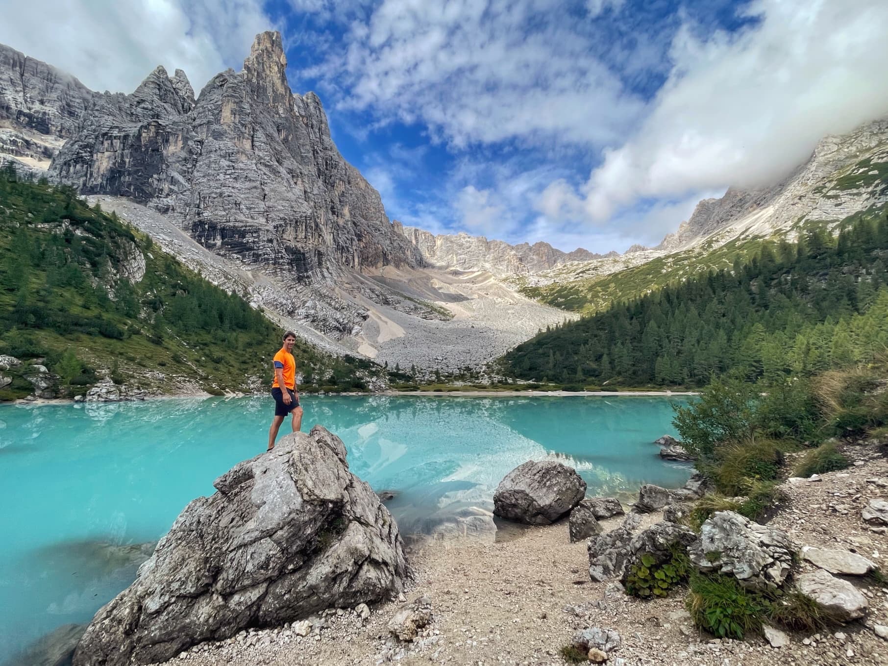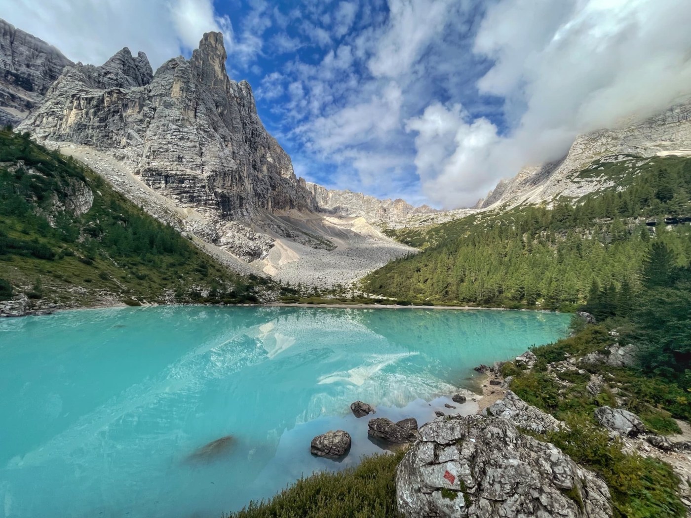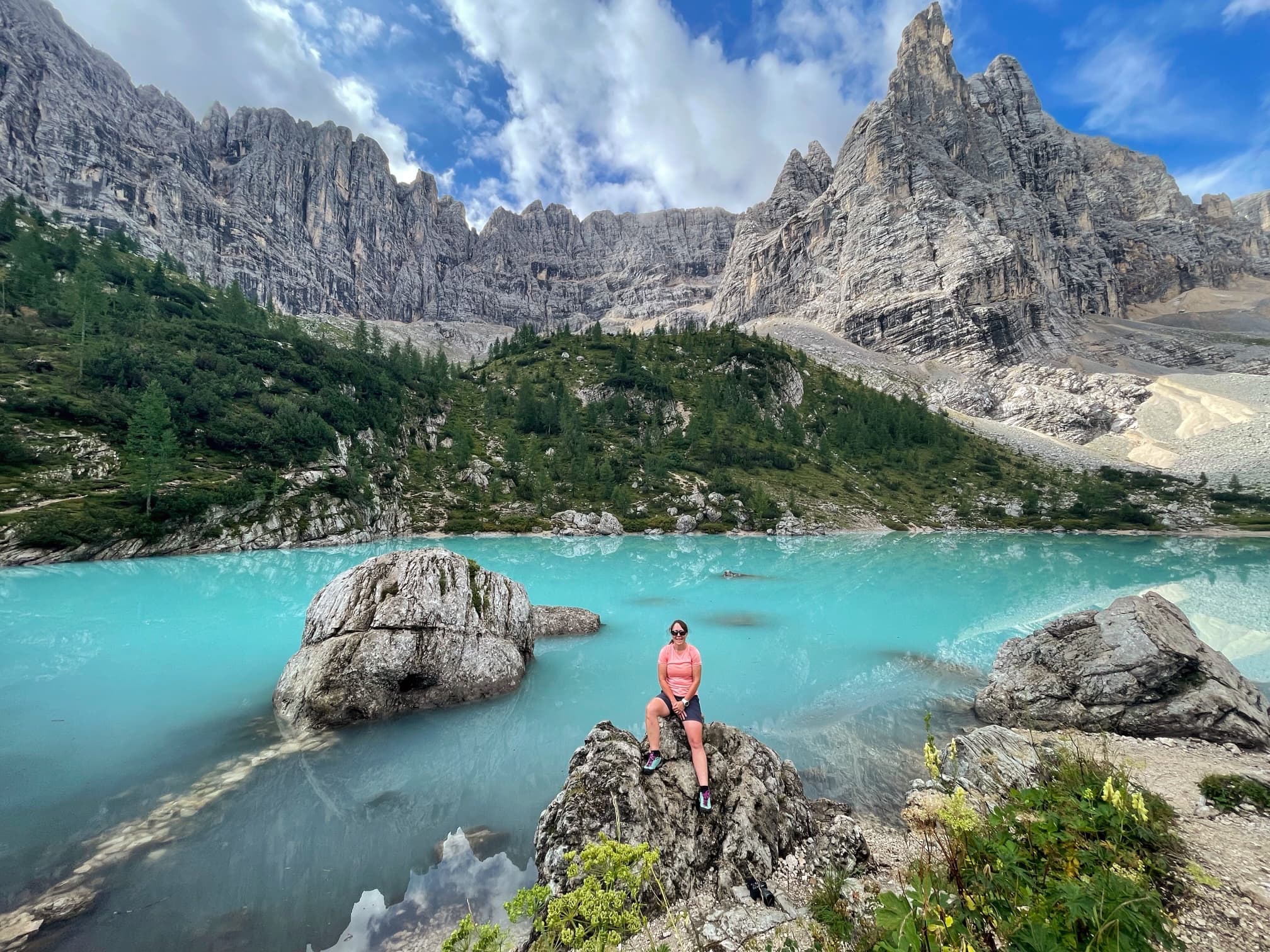 We have seen the most beautiful lake today. Lago di Sorapiss has milky turquoise blue water because of the powder suspended in it from the shrinking glaciers on Punta Sorapiss, which towers behind it.