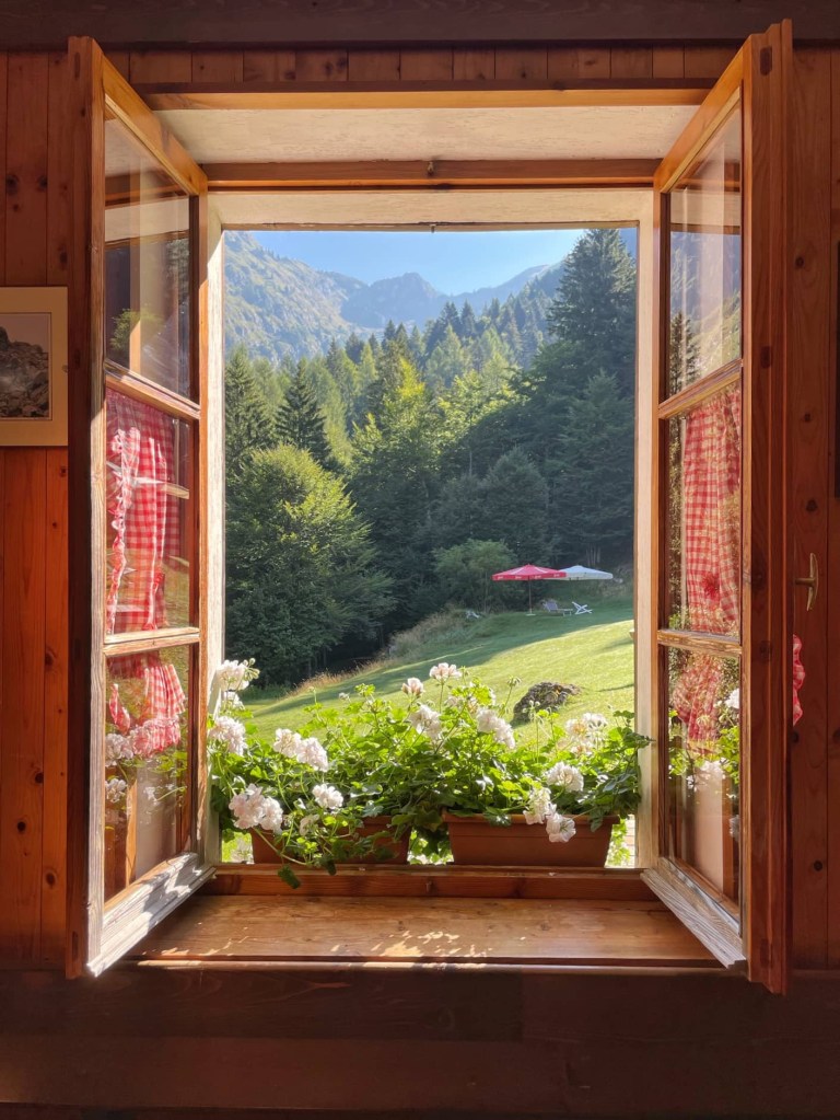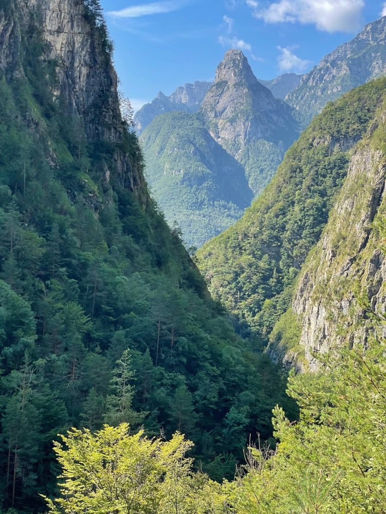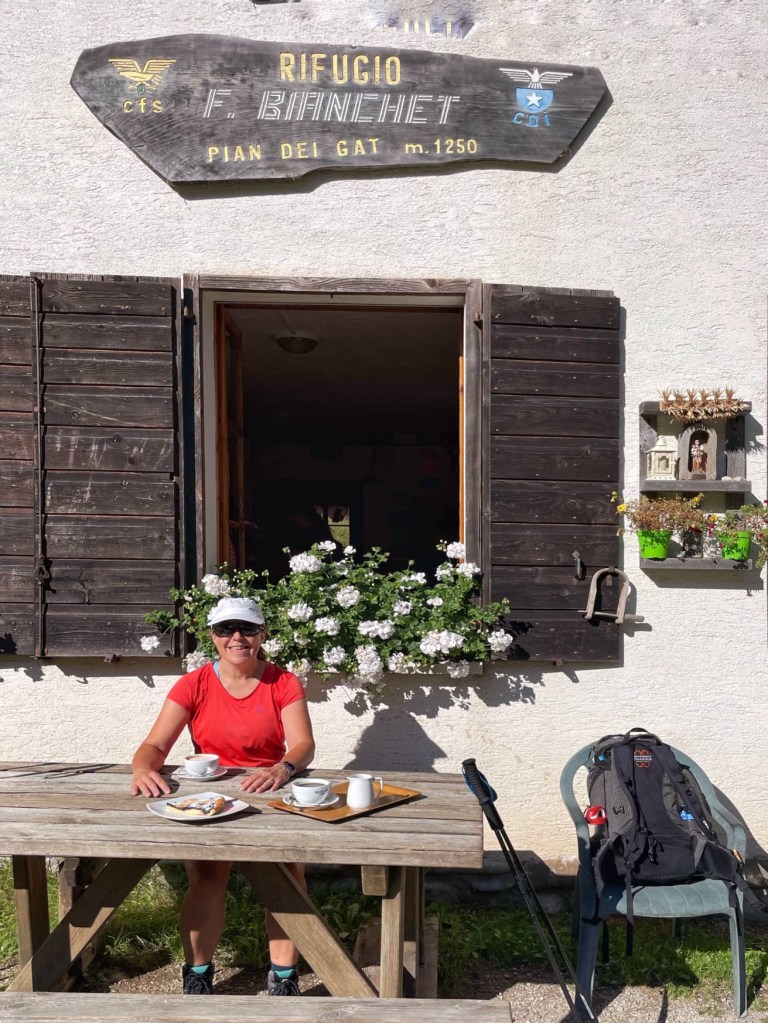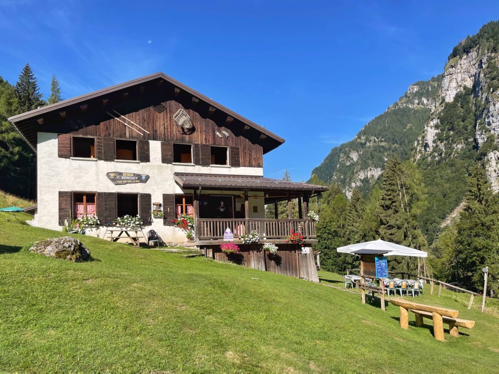 After a while, the path began to drop more steeply, but it was still easy walking, with leaf litter soft under our tired feet. Eventually, we reached Rifugio Bianchet (1245 metres), a pretty hut in a lovely clearing in the woods.