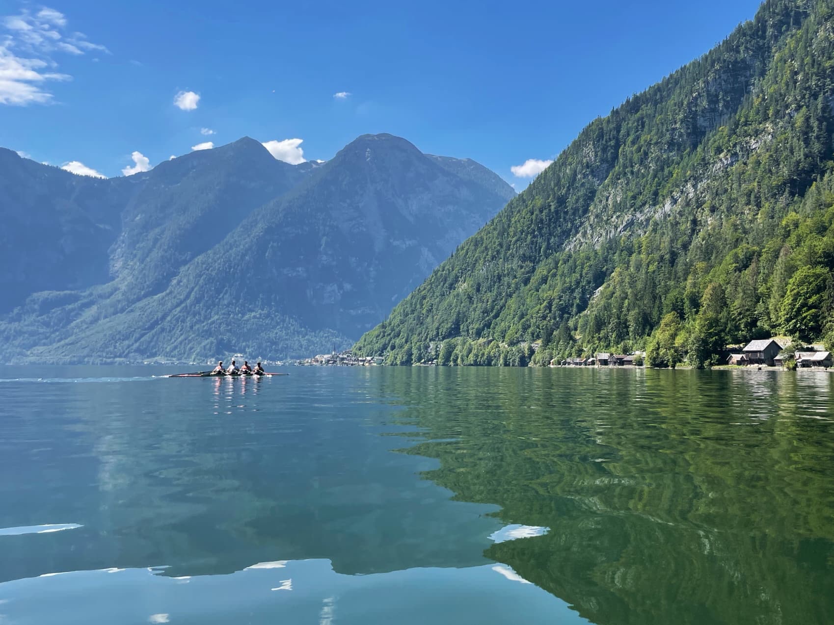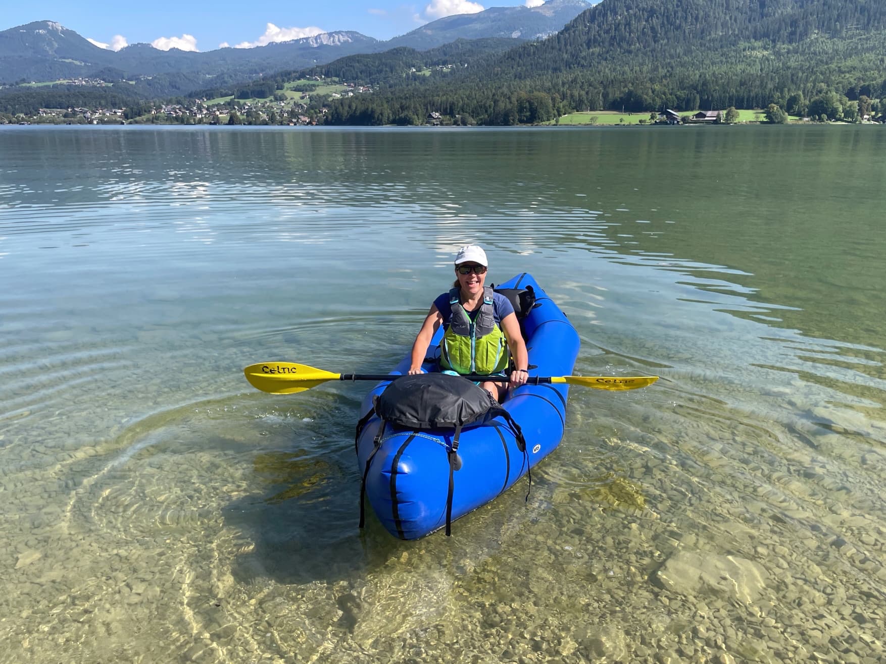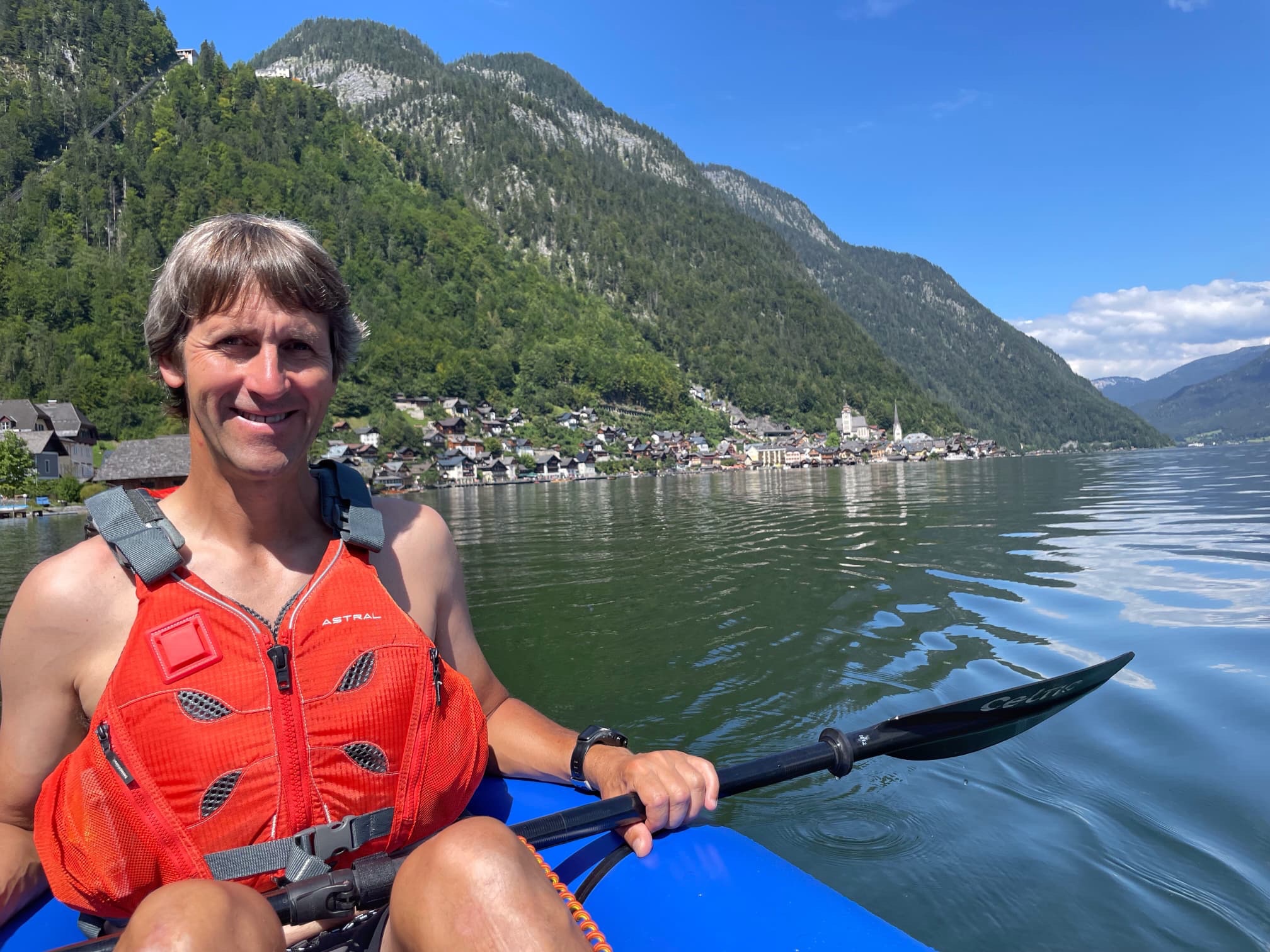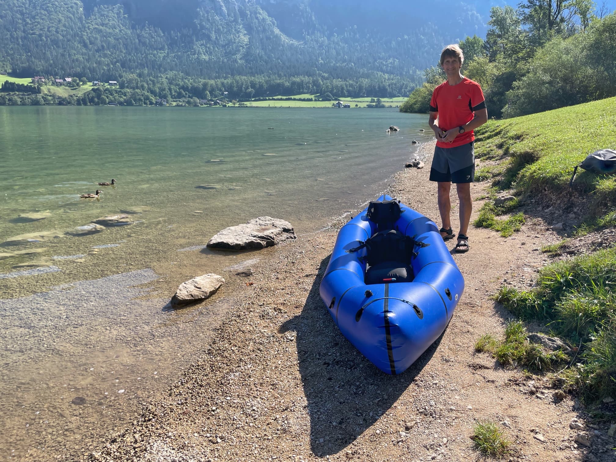 John found a free parking place big enough for Bertie, right on the lake, with a suitable beach to launch from. We inflated the packraft and set off to Hallstatt, about 5 kilometres away. Not far from the start, we ended up crossing a shallow section and had to get out, but the water was lovely and warm to paddle through, and the packraft is so light it’s easy to drag.