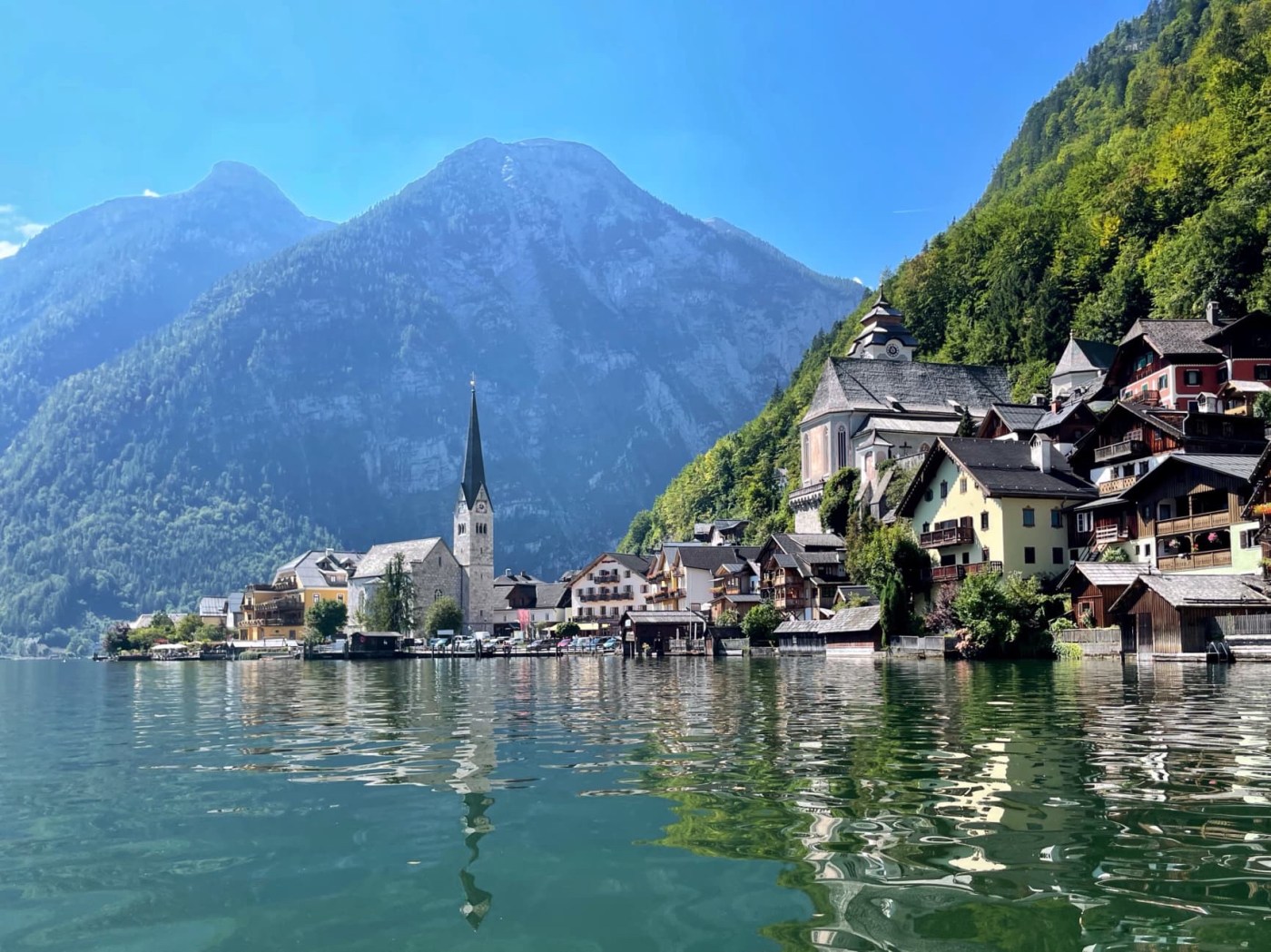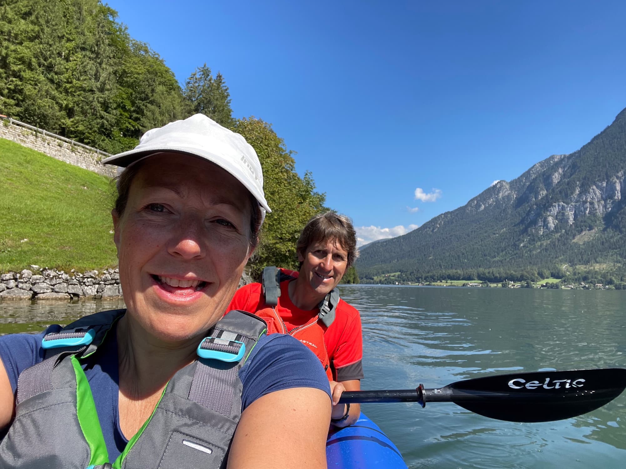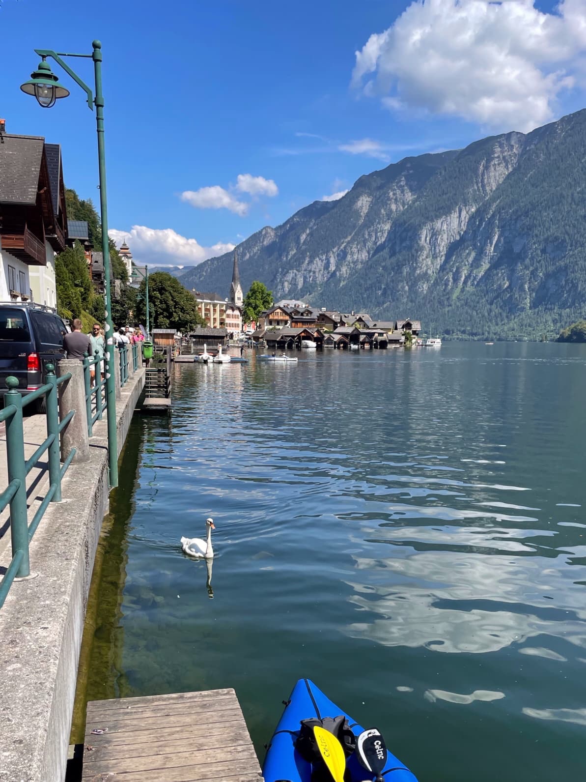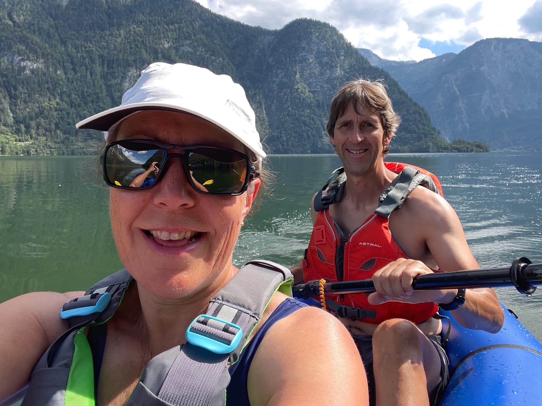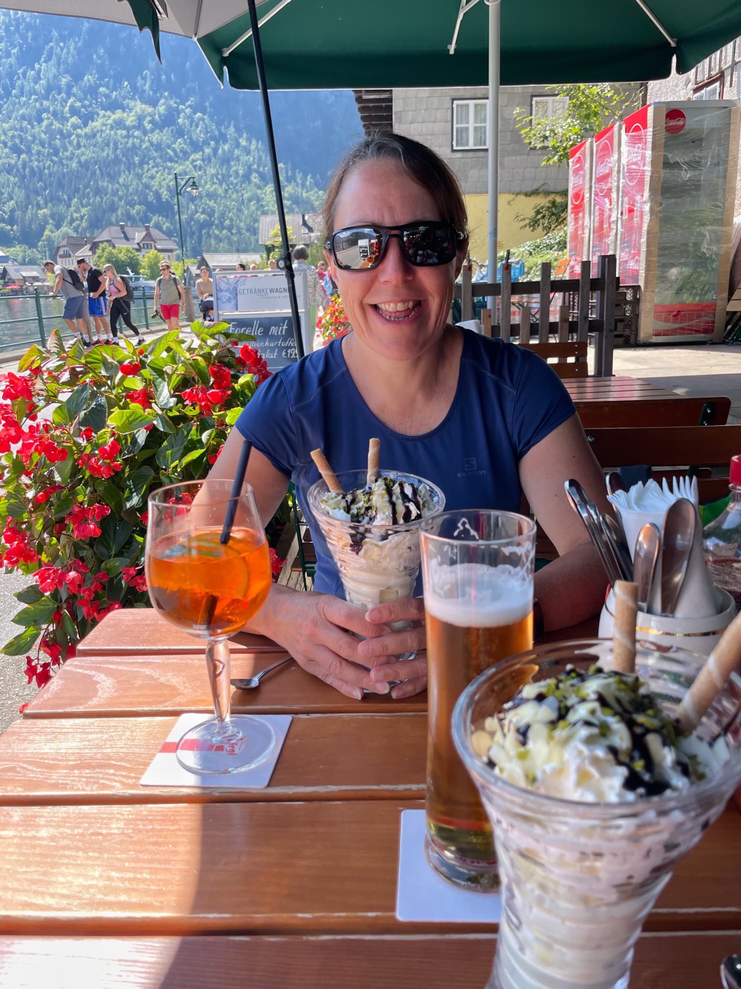 In Hallstatt, John tied up the packraft and we jumped out to visit a cafe… large ice creams, an Aperol spritz and a beer were delicious in the sunshine. It was much more fun paddling into town, compared with walking or driving 😊.