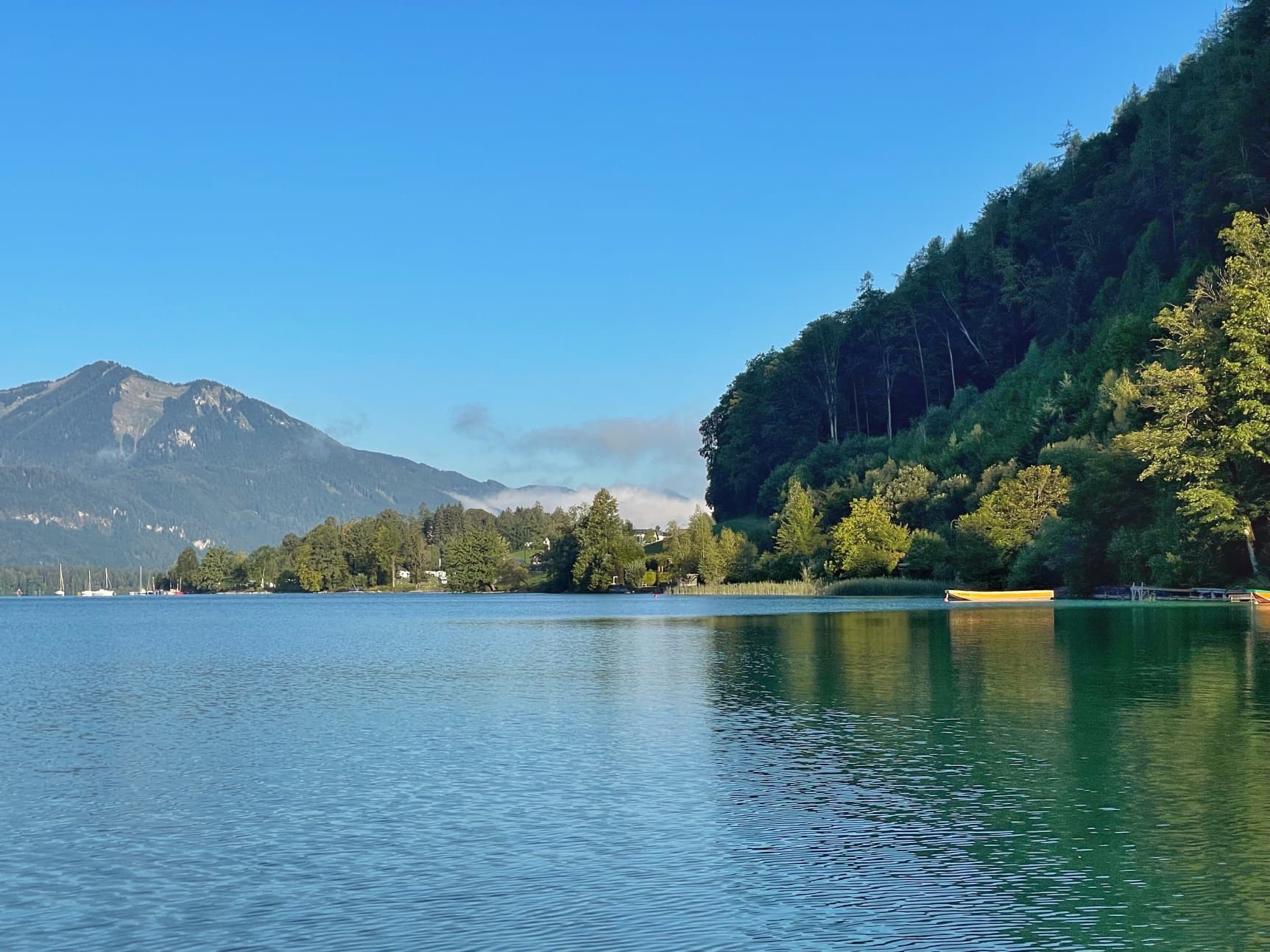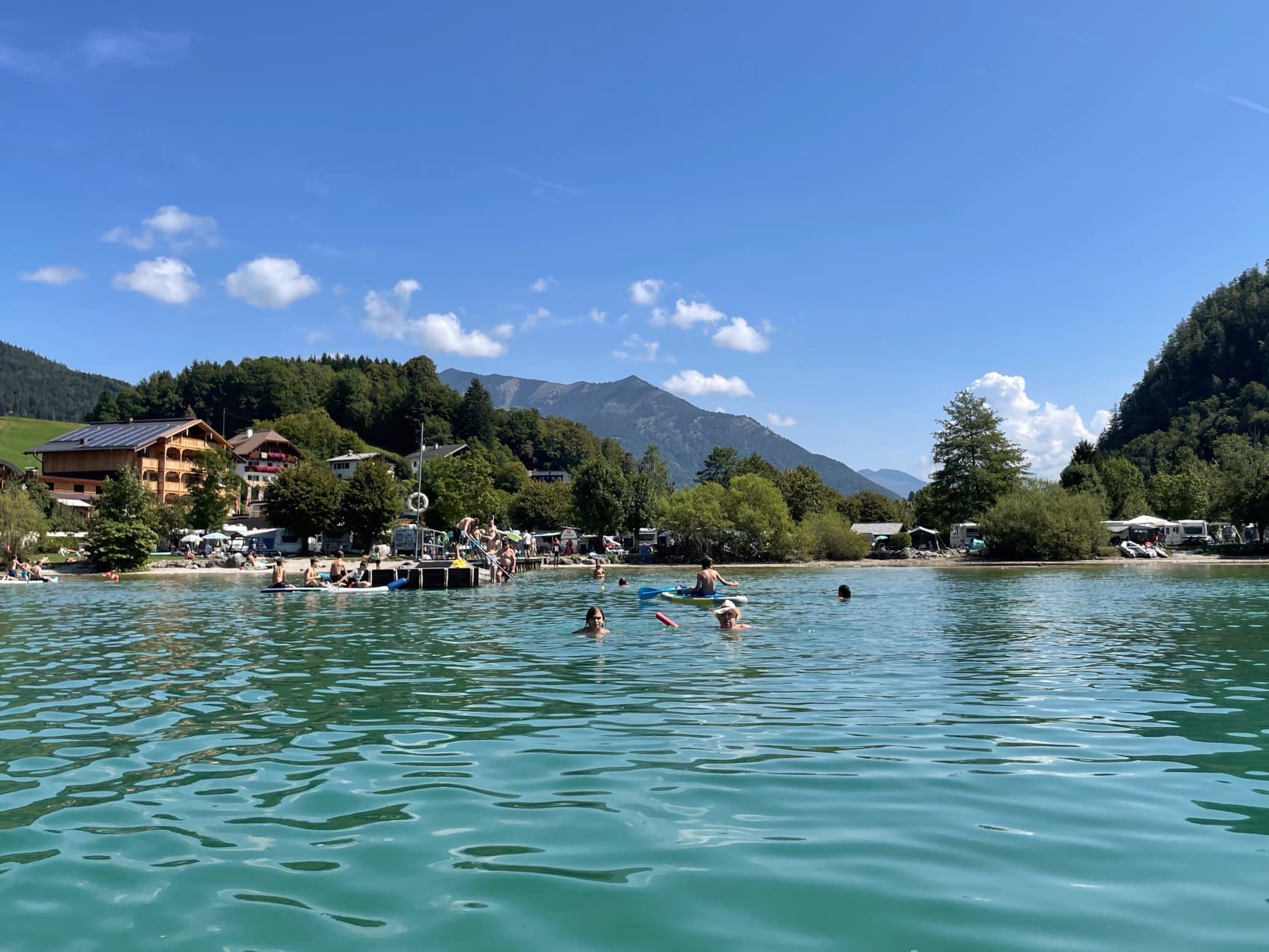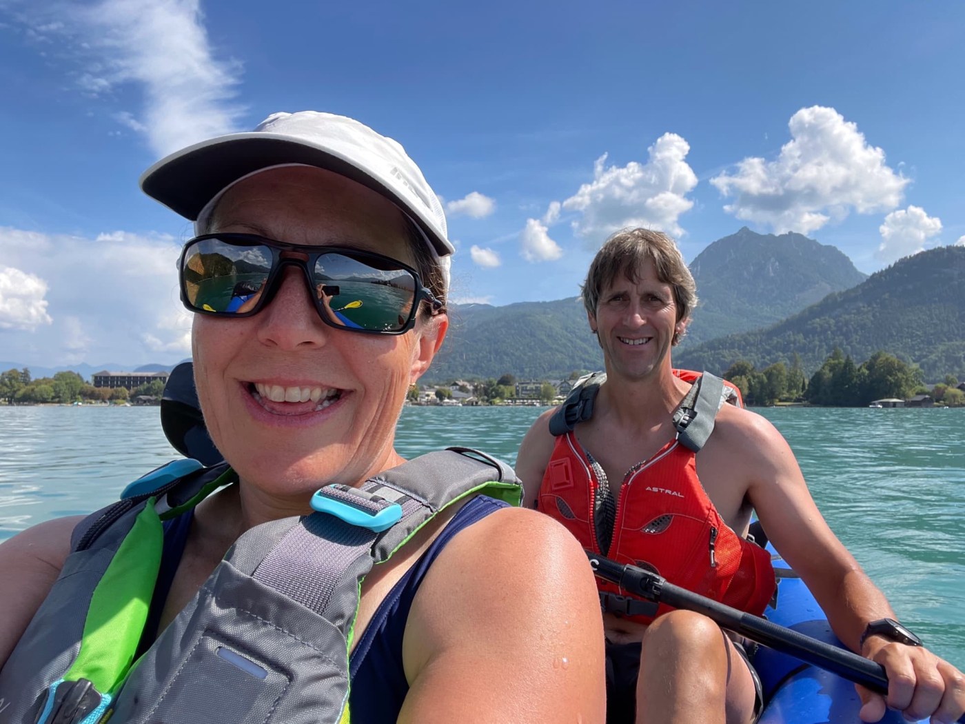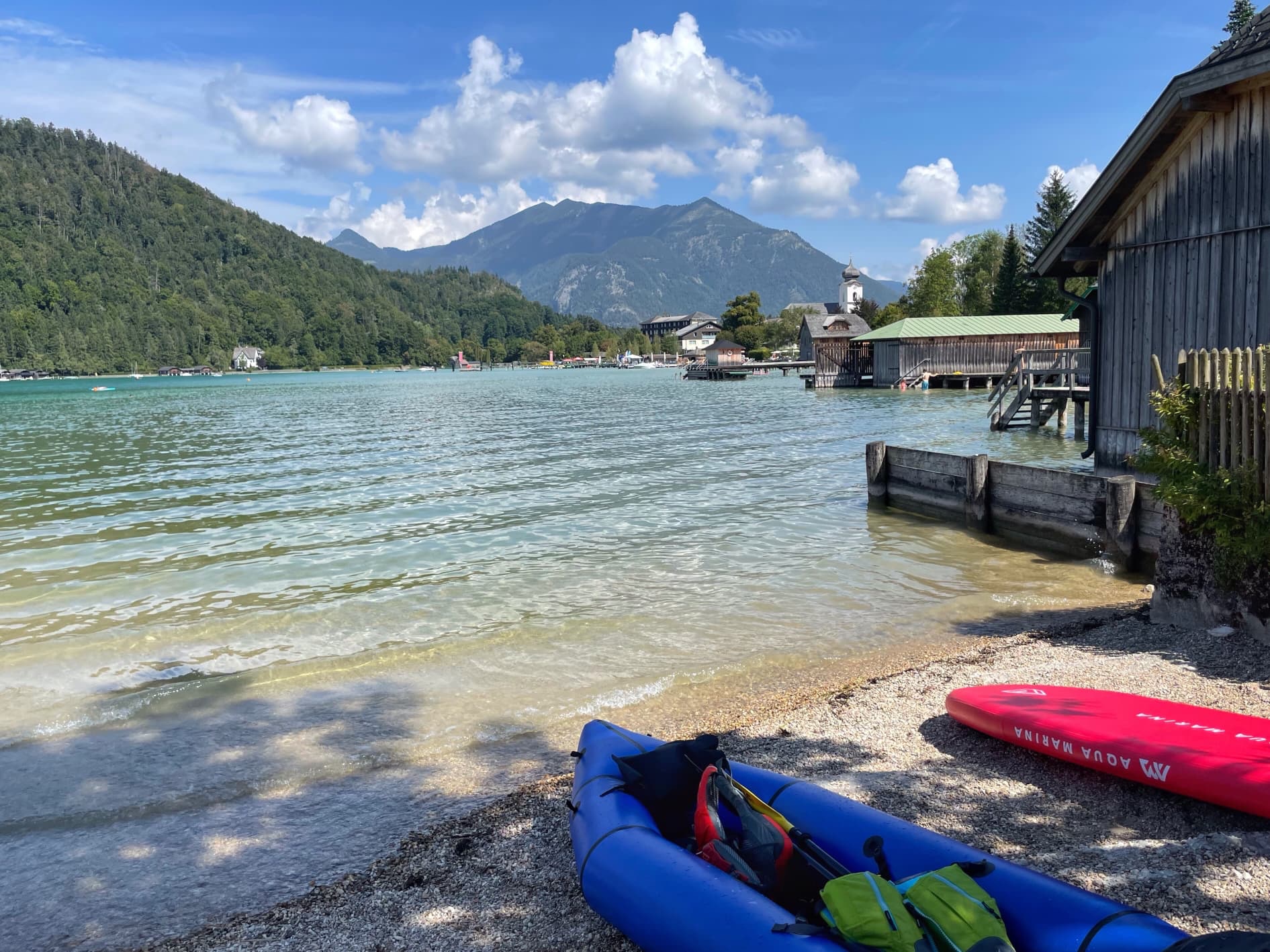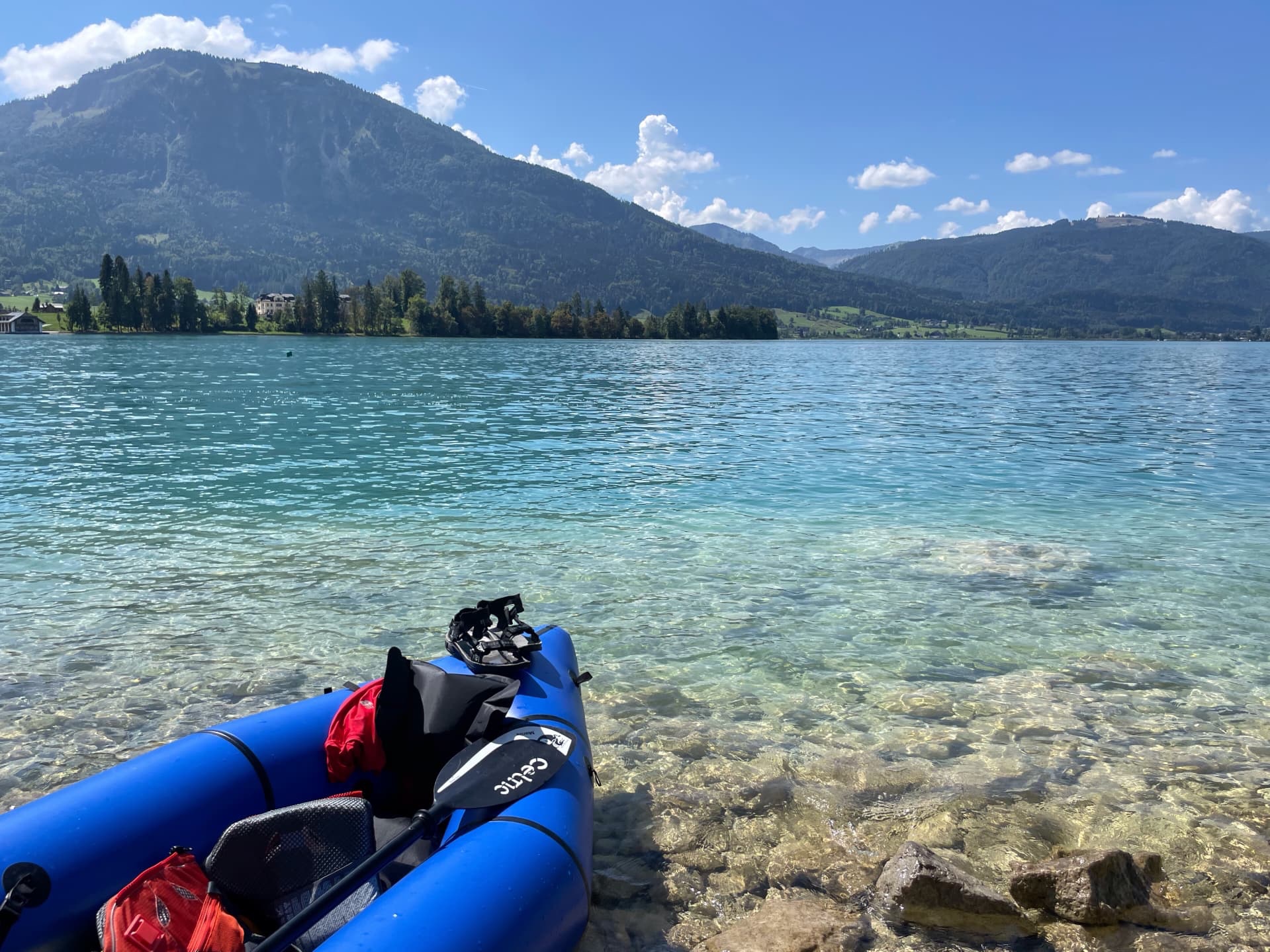 After lunch, we inflated the packraft and walked down to the lake. We left the busy area by the campsite… everyone seemed to be at the lakeside beach today… and paddled round the headland towards Strobl.