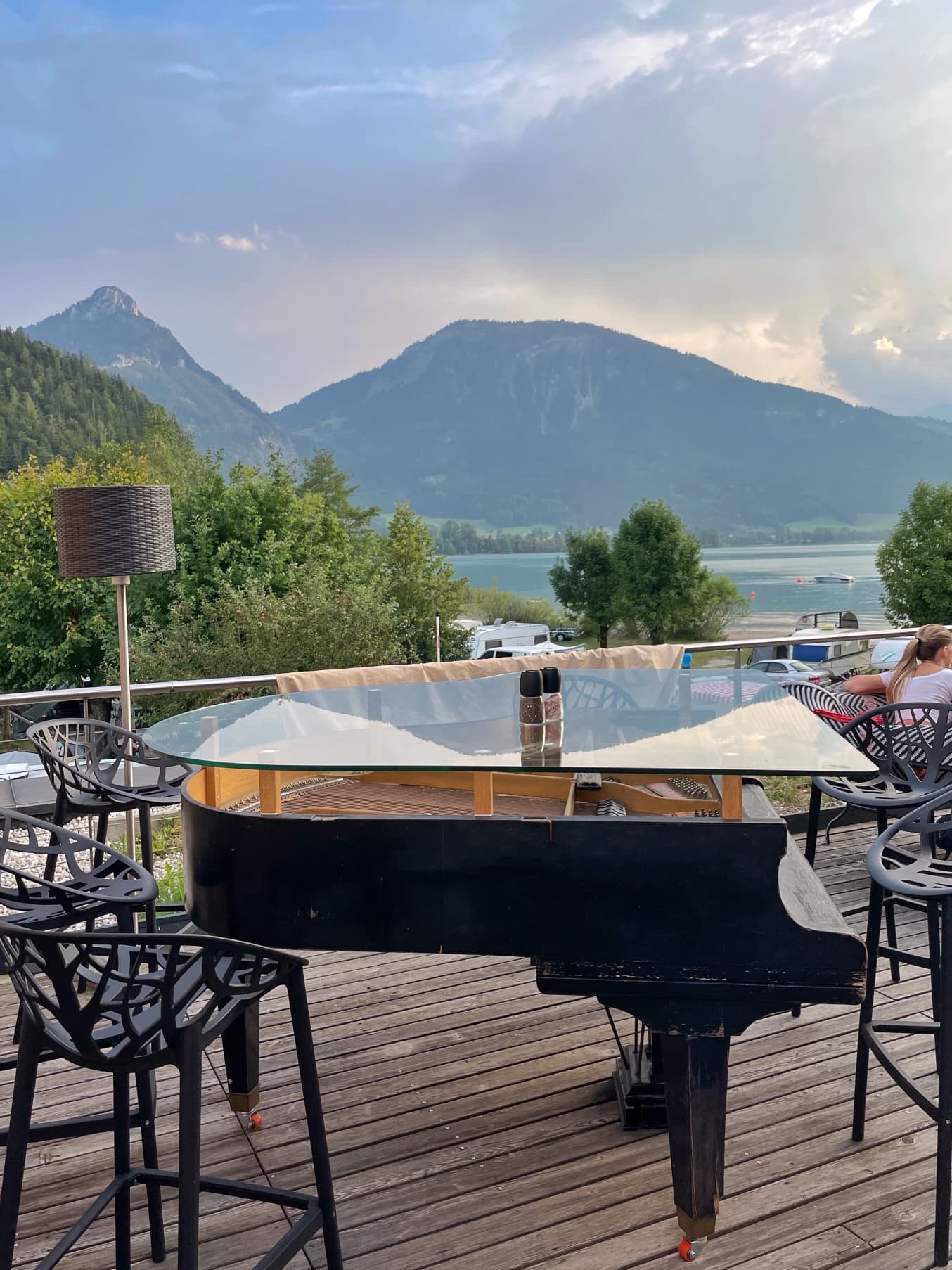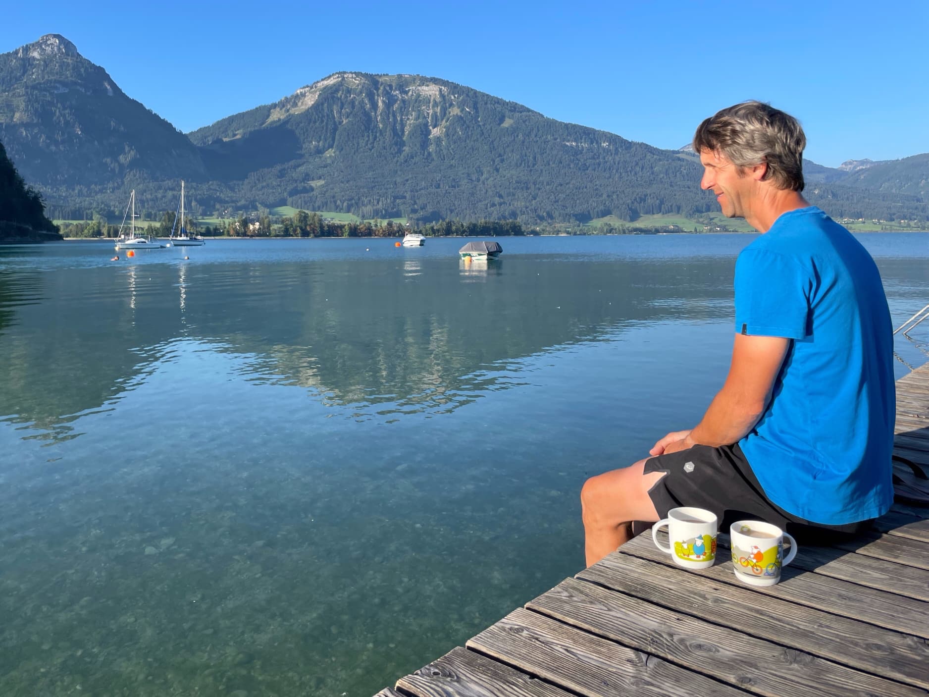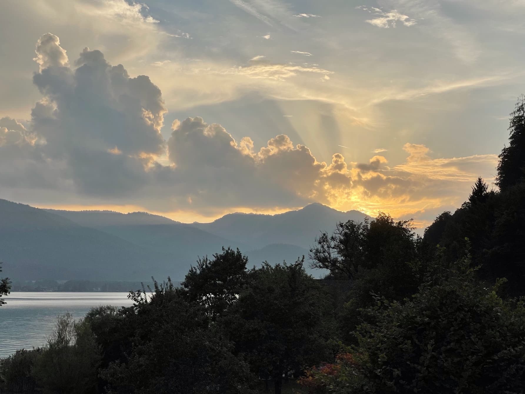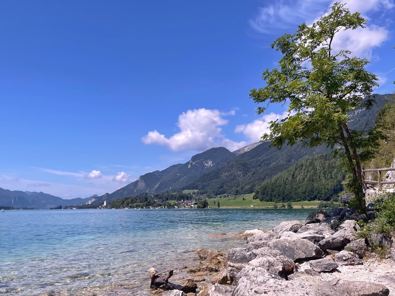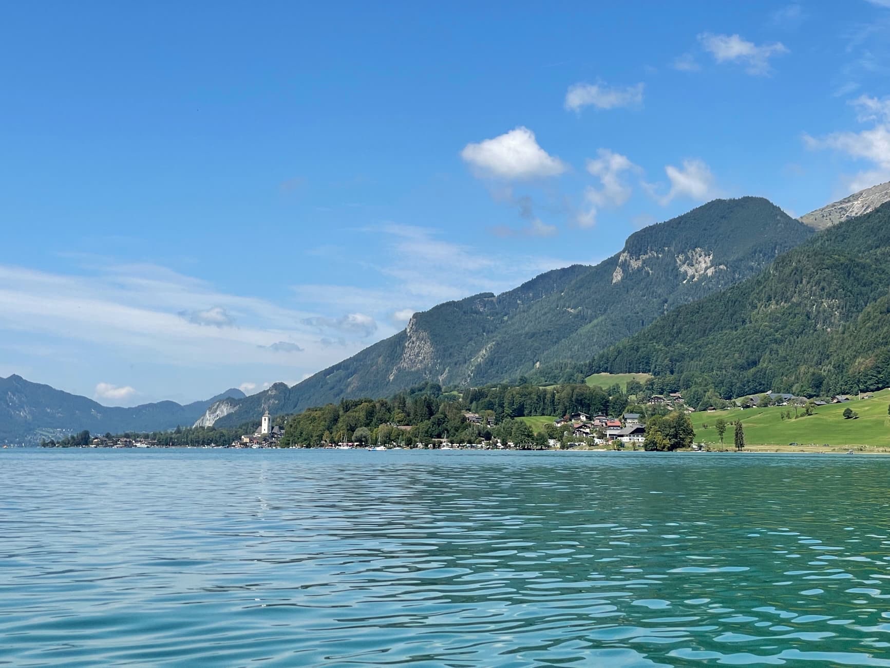 After lunch, we inflated the packraft and walked down to the lake. We left the busy area by the campsite… everyone seemed to be at the lakeside beach today… and paddled round the headland towards Strobl.
