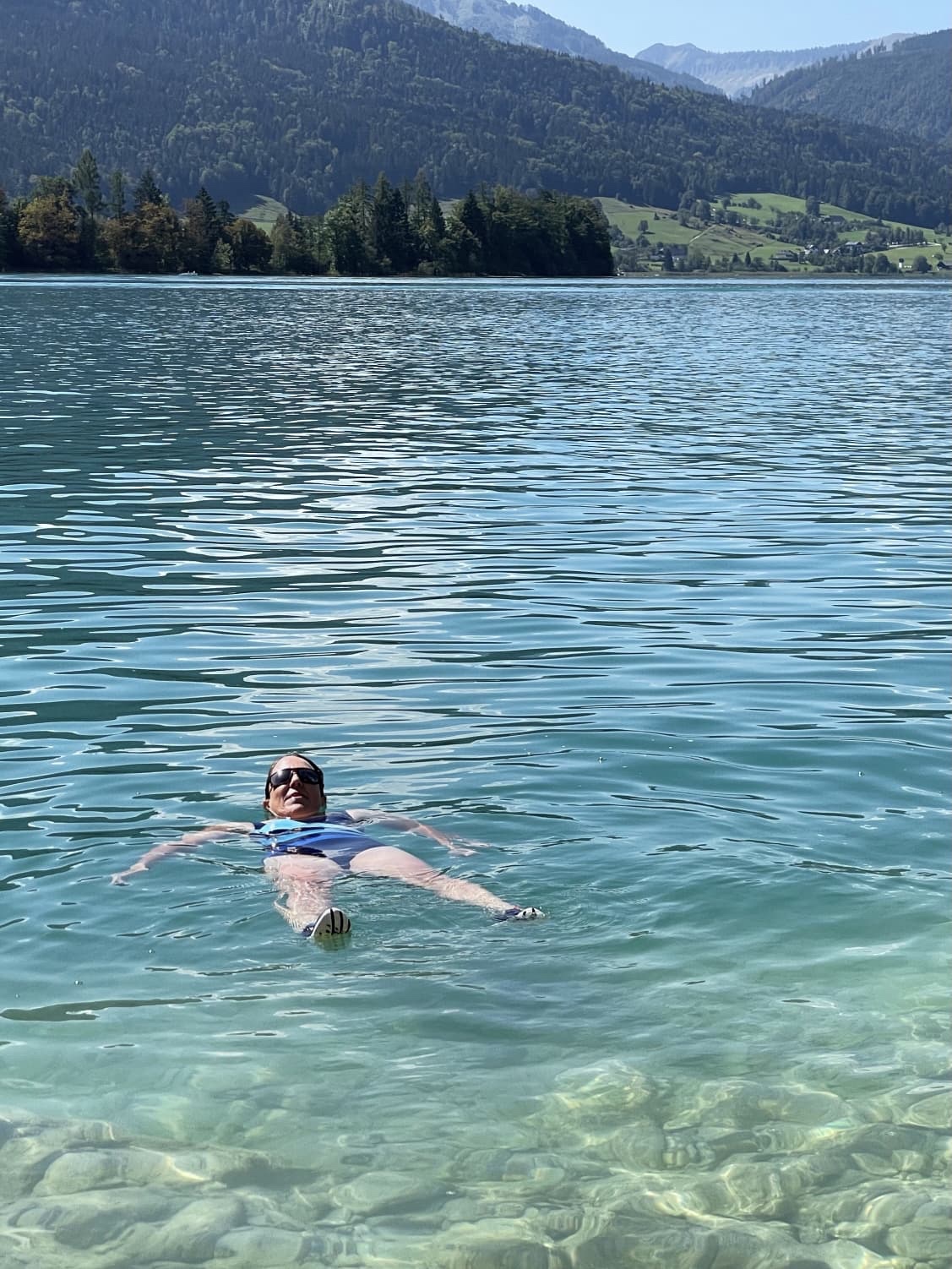 It was lovely and warm so we floated around for a while, watching the speedboats pulling water skiers, paragliders and people on rubber rings. We also saw a sea plane land on the lake.