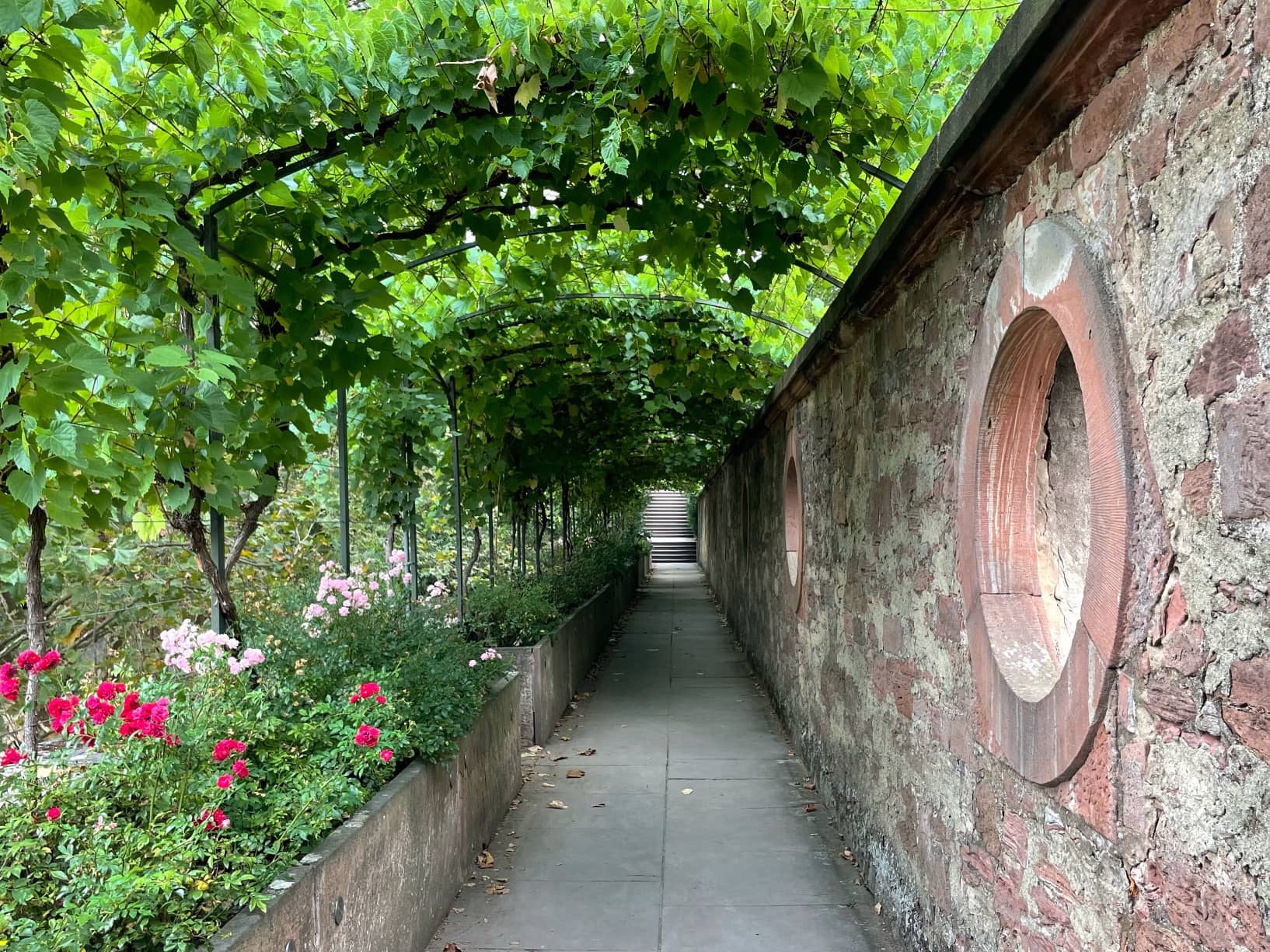 We wandered through the palace garden and along a pretty arcade with a beautiful view to a breakfast temple and the Pompejanum. The Pompejanum is a replica of a Roman house from Pompeii with a vineyard. It was commissioned by King Ludwig I and opened in 1850.