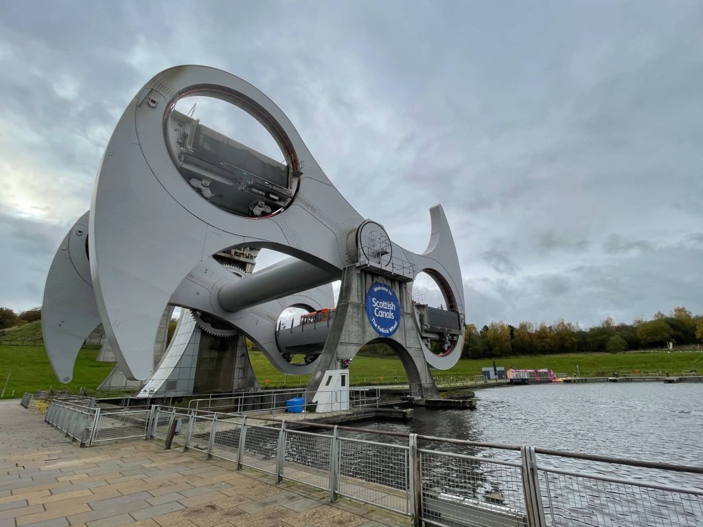 We then headed to the Falkirk Wheel, not far away. I was far more fascinated with this boat lift than I’d expected. It’s an impressive and elegant feat of engineering that gently swings canal boats between the Union Canal and the Forth and Clyde Canal, which have a height difference of 35 metres, equivalent to 11 traditional locks.