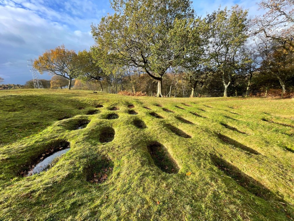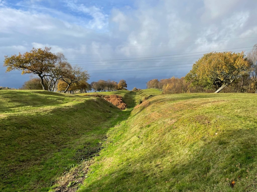 The Antonine Wall is a 60-kilometre (37-mile) rampart, which was built by the Romans around AD140. It stretched across Scotland from the Firth of Clyde to the Firth of Forth and was defended by forts and ditches, including defensive pits, which I hadn’t seen before. We wandered along the ‘wall’ at Rough Castle where it’s well preserved.