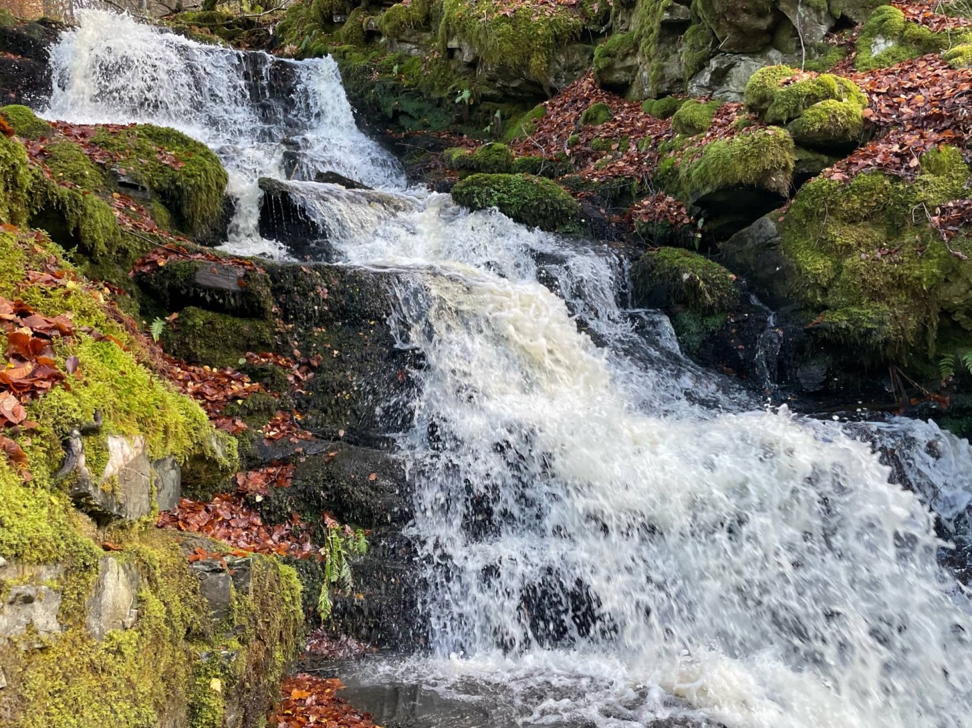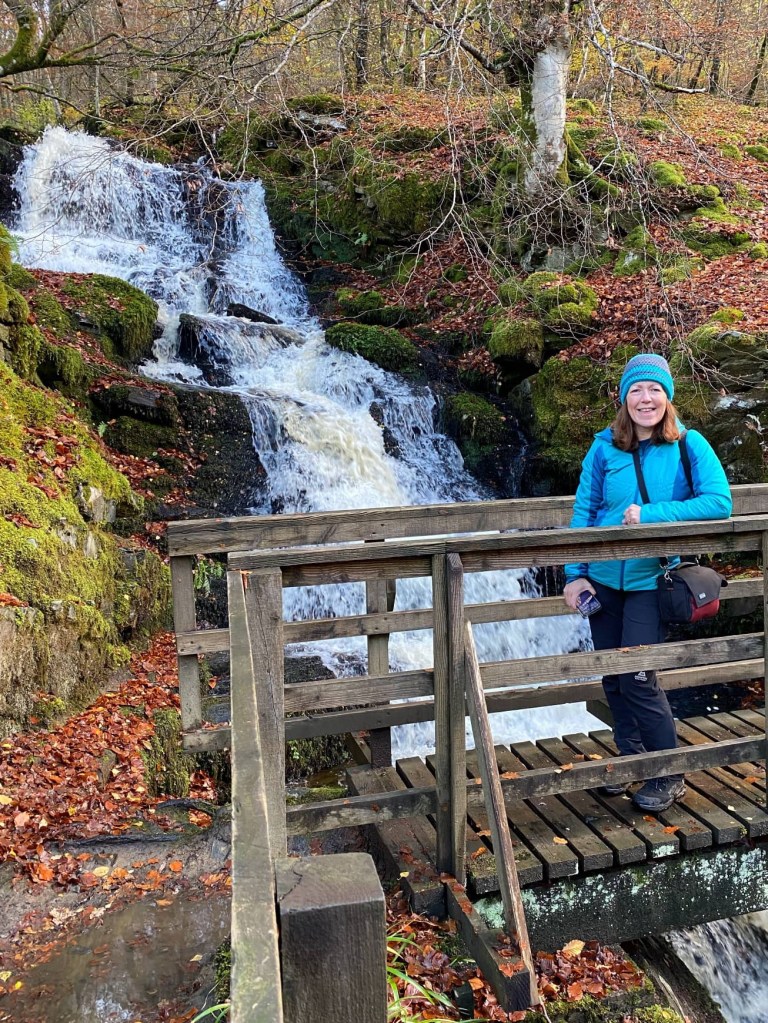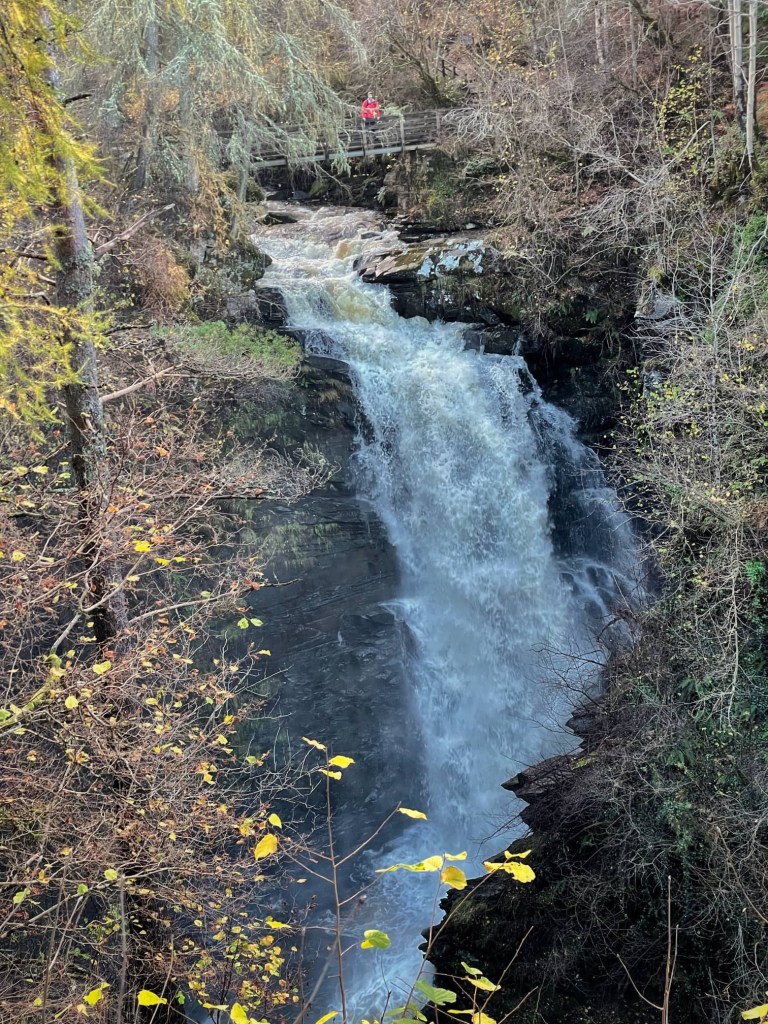 Back at Bertie, we drove to Loch Tummel for lunch before heading to Aberfeldy for our second walk of the day, the Birks of Aberfeldy. We followed the Moness Burn to a flight of five waterfalls then, further up the gorge, to the thundering Falls of Moness where the water dropped 24 metres over a stone sill.