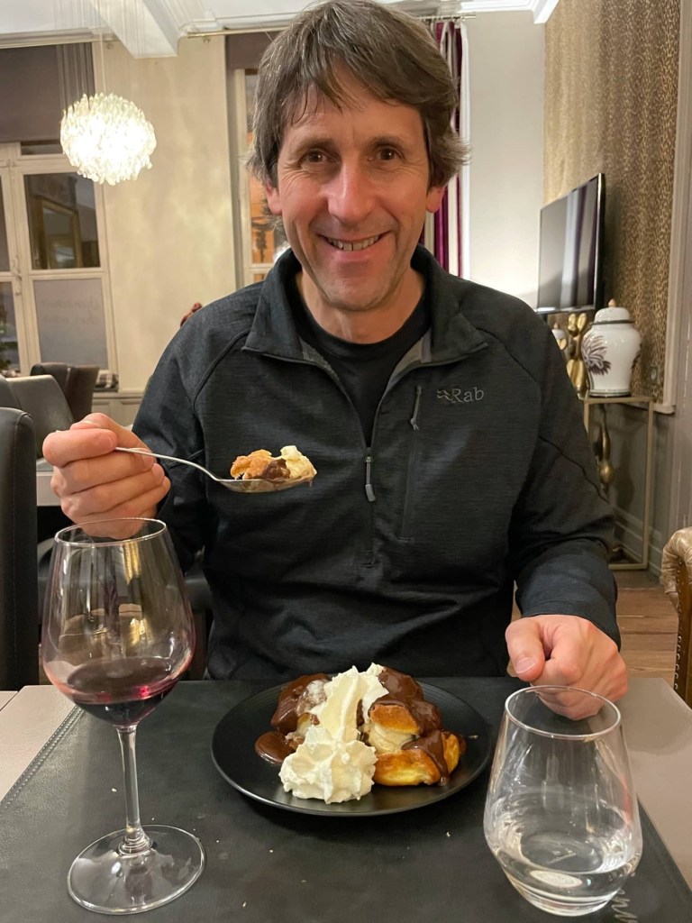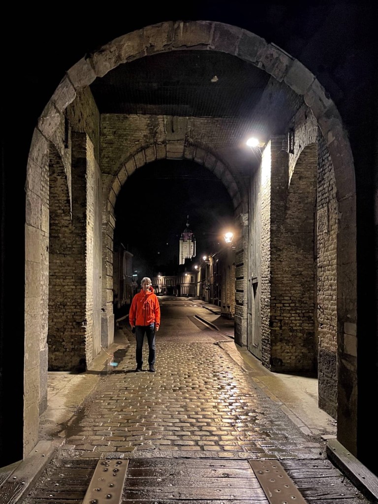 It’s a very pretty place with a belfry and fortifications, although it doesn’t look it’s best in the rain. We had dinner at a lovely restaurant… and had forgotten just how good the food and wine is in France. Now we’re ready for a brew in bed. Goodnight!