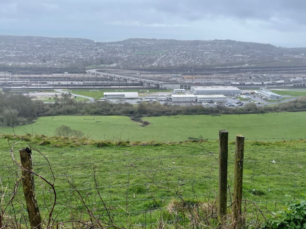 There were two cars in front of us, who also appeared to be following their sat nav. We kept meeting cars and vans coming in the opposite direction, and having to squeeze onto the verge to pass. Finally, we reached the top of the hill, with a good view down over the Channel Tunnel terminal.
