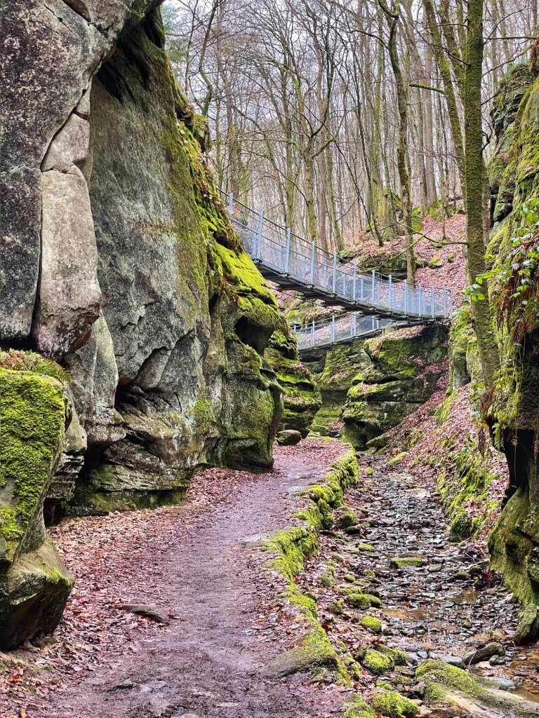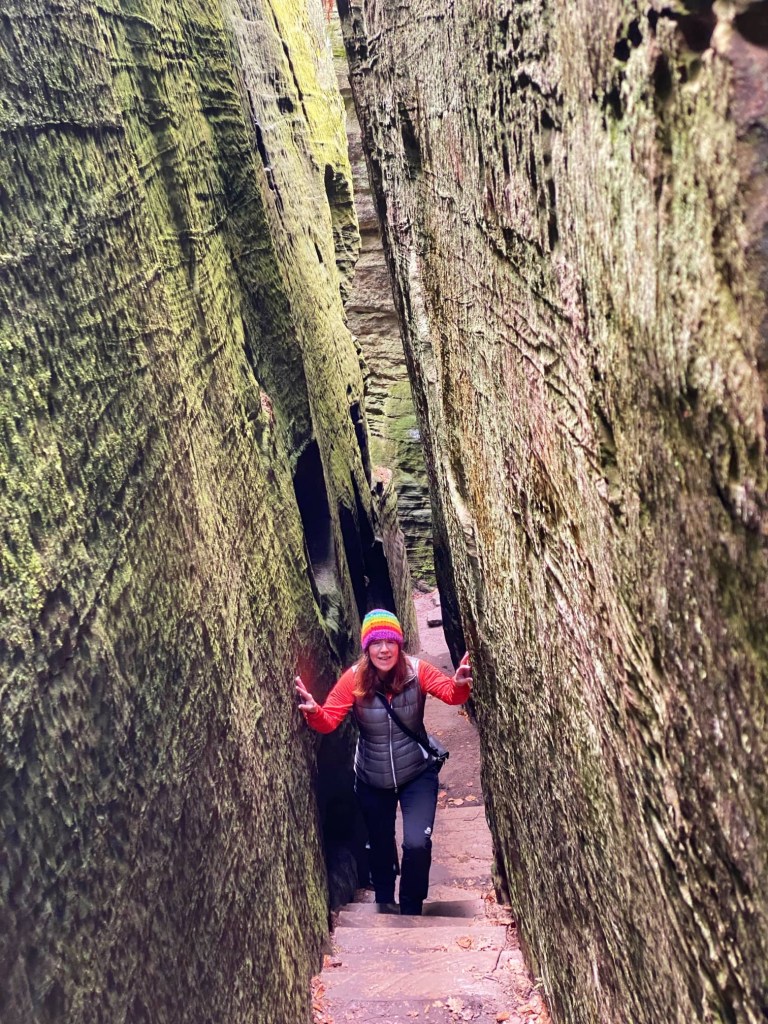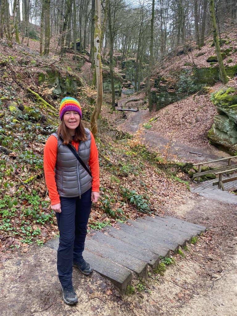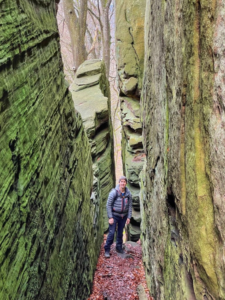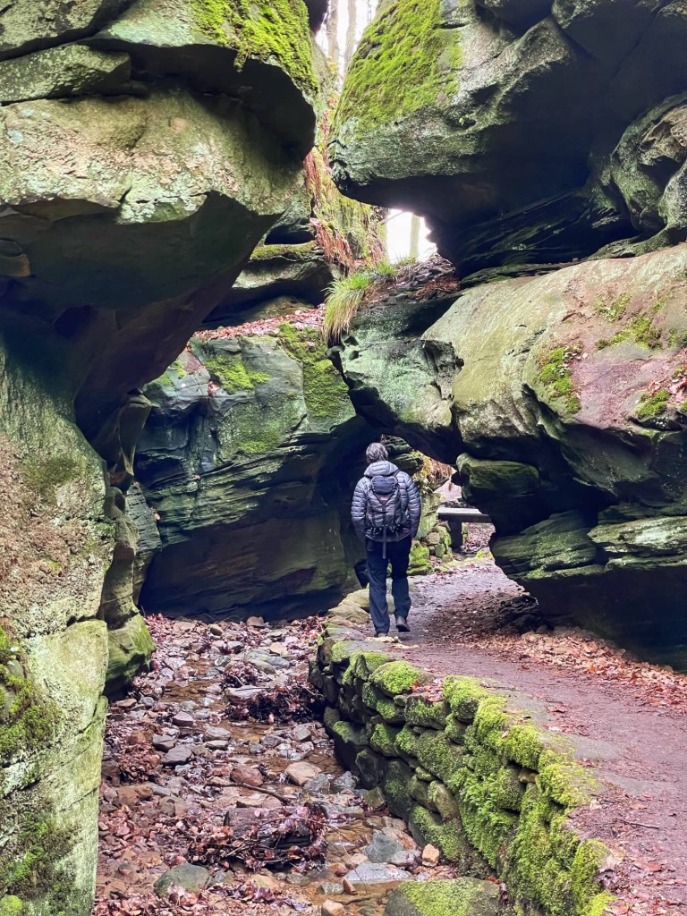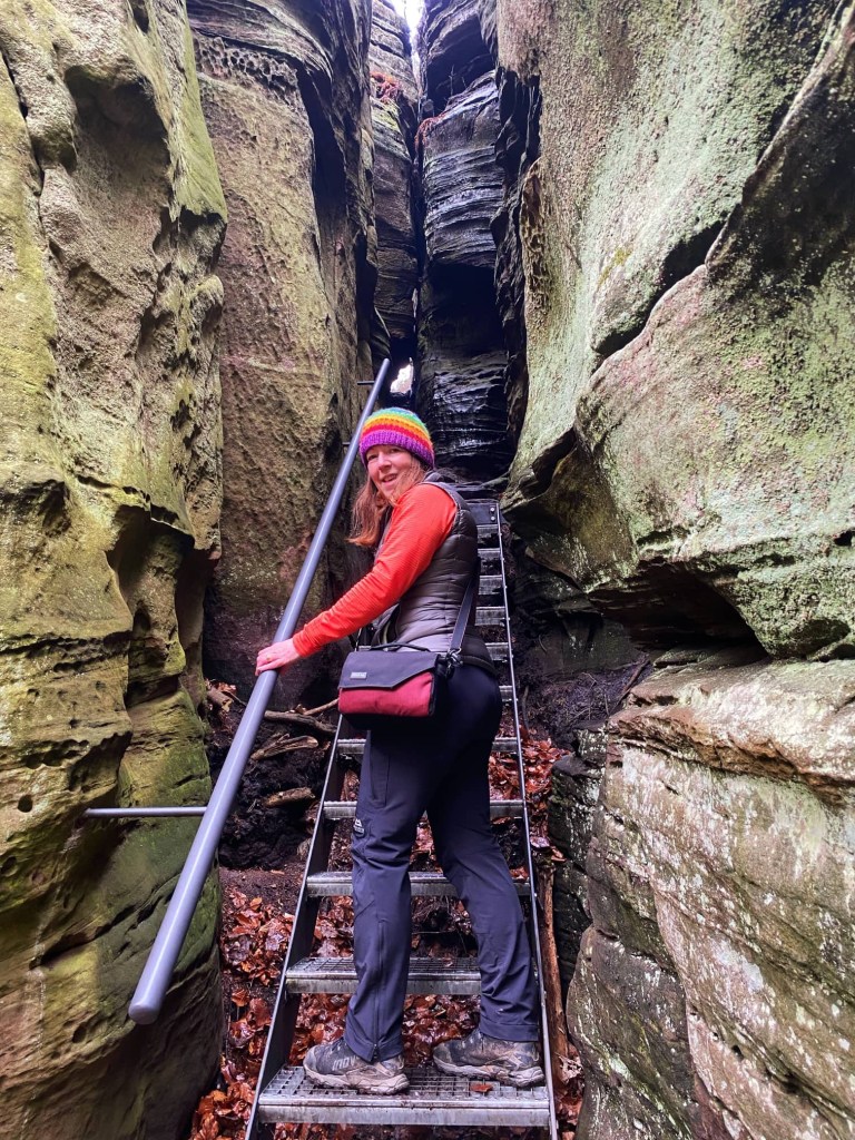 Then we climbed steps and an iron ladder through sandstone cliffs known as Raiberhiel and Alderhorst. It was fun squeezing through narrow, deep clefts in the rock.