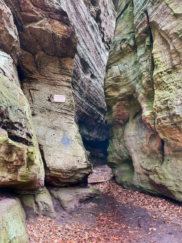 There was so much to see on the walk. Next we came across Siweschlëff (seven gorges) where deep crevices have divided the sandstone into a labyrinth of high stone towers. There were signposts for a short trail through the 7 clefts in the rocks. However, I gave up at number 7 because it became very narrow and I thought I might get wedged in it!
