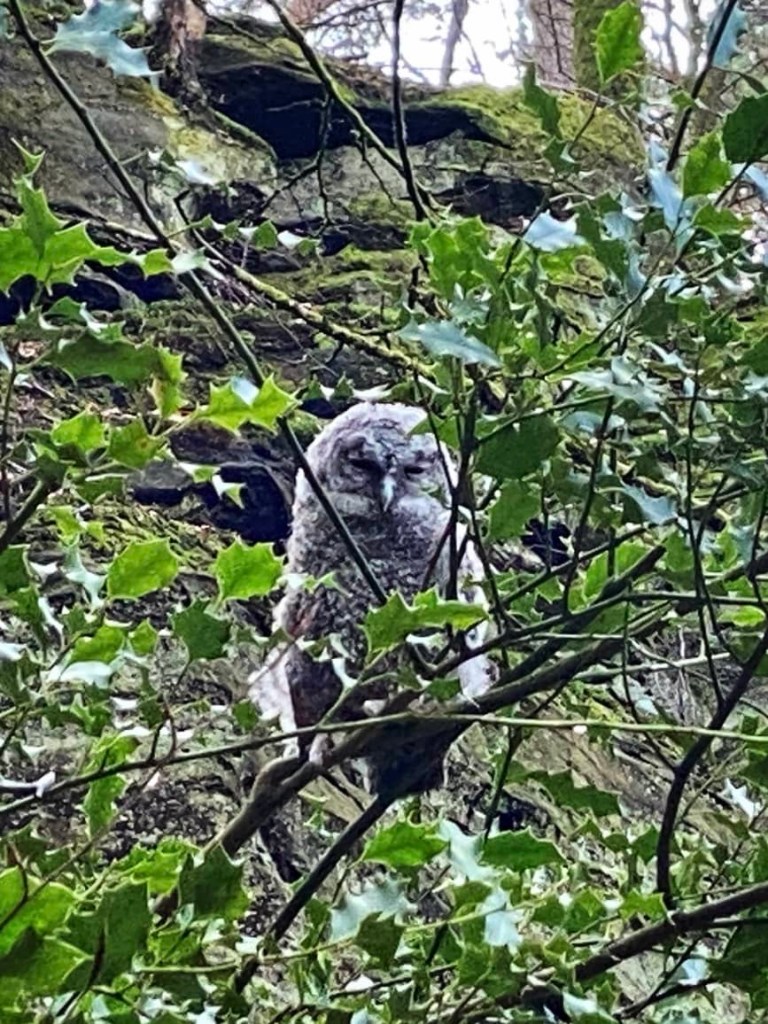The path continued to wind through the woods past many more sandstone cliffs. Some walkers in front of us were taking pictures of two fluffy owls near the path… one in a holly bush and other on a rock. They looked like babies who may have fallen from their nest. I hope they survive.
