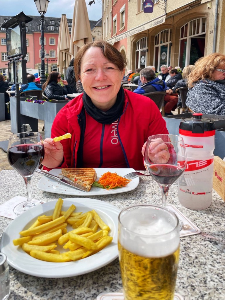 It was uphill all the way back to Berdorf and I was glad of the motor on my bike as we climbed through woodland, past amazing sandstone cliffs. It’s such a beautiful area, I’m surprised there are so few British people here. I think we’ll have another walk tomorrow… my bum and shoulders aren’t used to cycling!