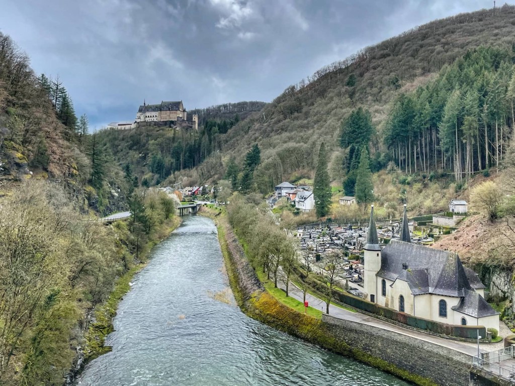 From Stolzembourg, we retraced our route to Vianden. As we went round the Our loop again, we could see Falkenstein Castle high on the hillside on the other side of the river in Germany. Then, soon after, Vianden Castle appeared high above the town and river.
