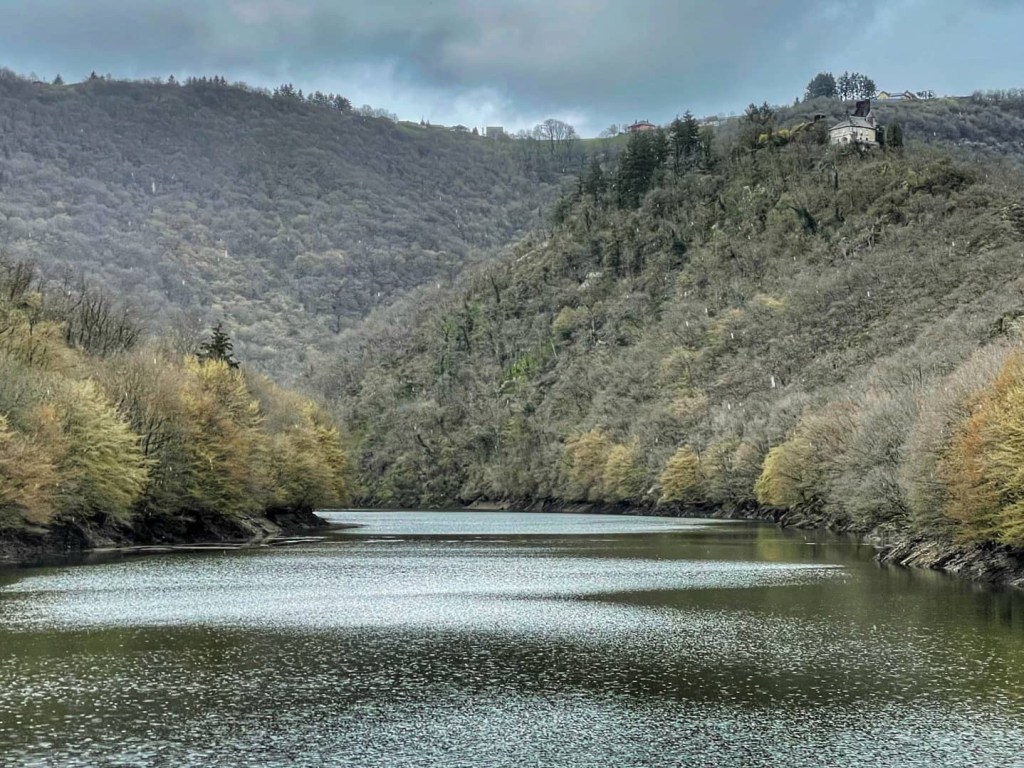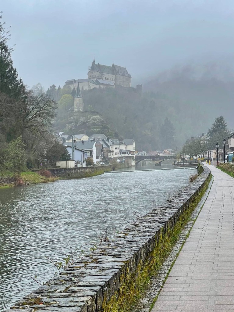 I wandered along the river, watching a graceful heron, which kept flying ahead of me. The castle and hilltops were shrouded in mist, but everywhere was still very pretty. Arriving at the bakery, I was disappointed to find a sign saying closed between 10th and 17th April… today being the 12th! Typical… at least a little grocery store was open so I could get some basic supplies.