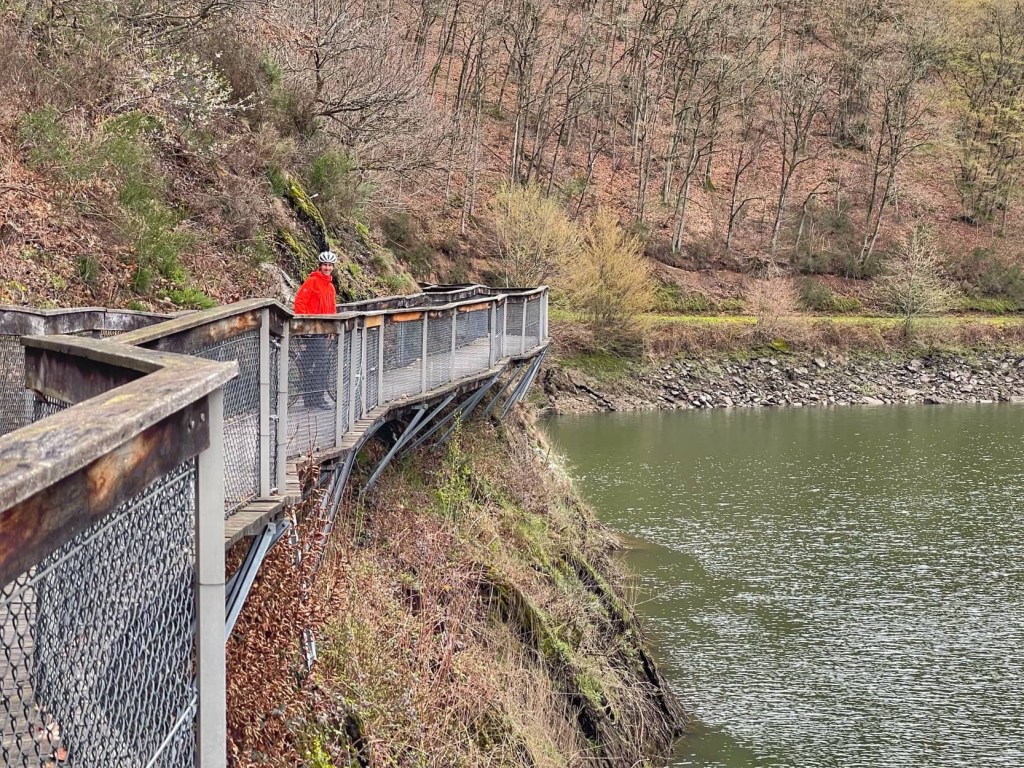 We followed the Ourdall Promenade from Vianden, across a barrage and then over several sections of board walk above the water. The path then went through pretty woodland as we went around a huge loop in the river.