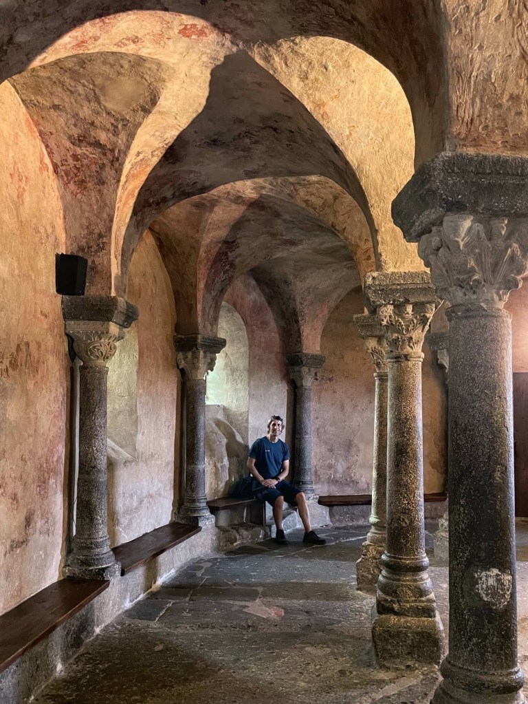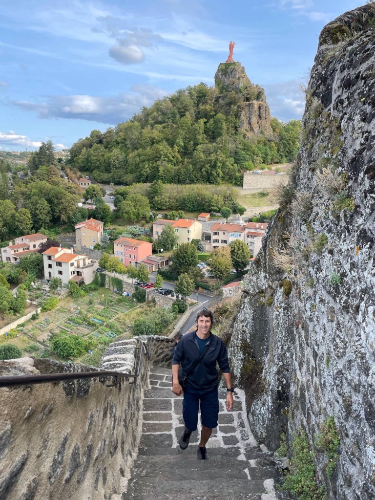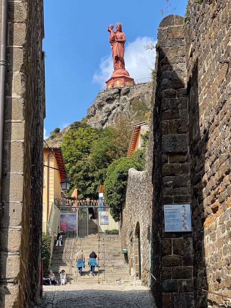 We climbed 268 steps around the rock to the top, from where the views were amazing, particularly of the Statue Notre-Dame de France and the cathedral… and of Bertie below! The chapel was pretty inside and, once the tour party left, we had it to ourselves.