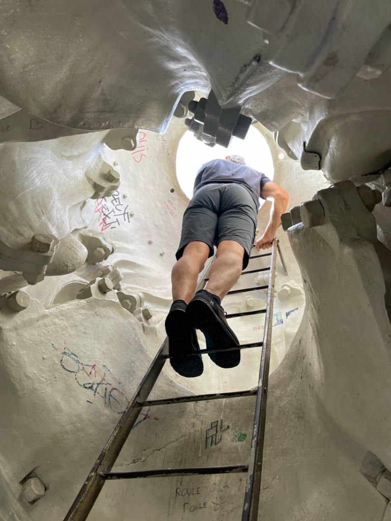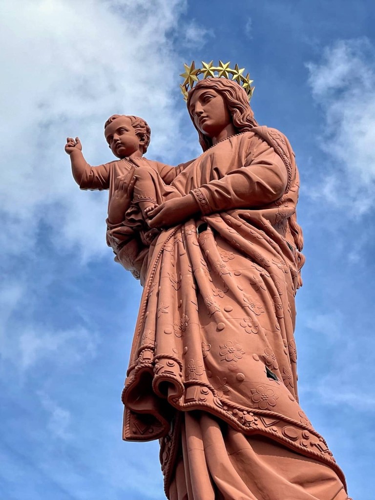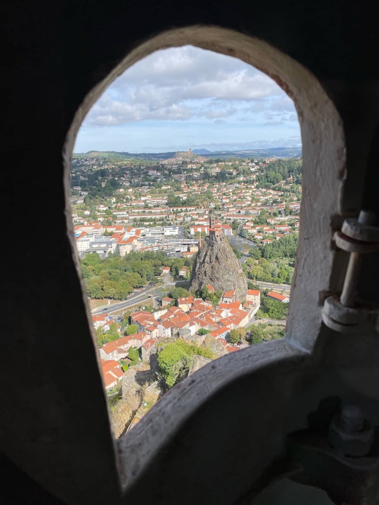 This morning we climbed up to the Statue of our Lady of France, or Notre-Dame de France. This sits on a volcanic pinnacle that towers high above the town and the chapel on the pointy rock, Rocher Saint-Michel d’Aiguilhe, which we visited yesterday. It was a steep climb to the top of the rock, and then another 262 steps inside the statue to pop our heads out at the top of her head. There was only room at the top for 1 person at a time and I think we both had jelly legs on the ladder 😱.