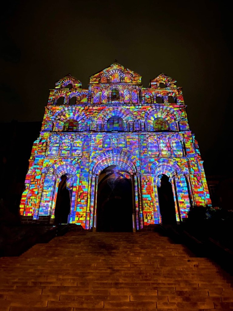 The Puy de Lumières yesterday evening was better than either of us was expecting. The light show was set to music, with different themes and stories projected onto each building or monument. The one on the pointy rock was my favourite.