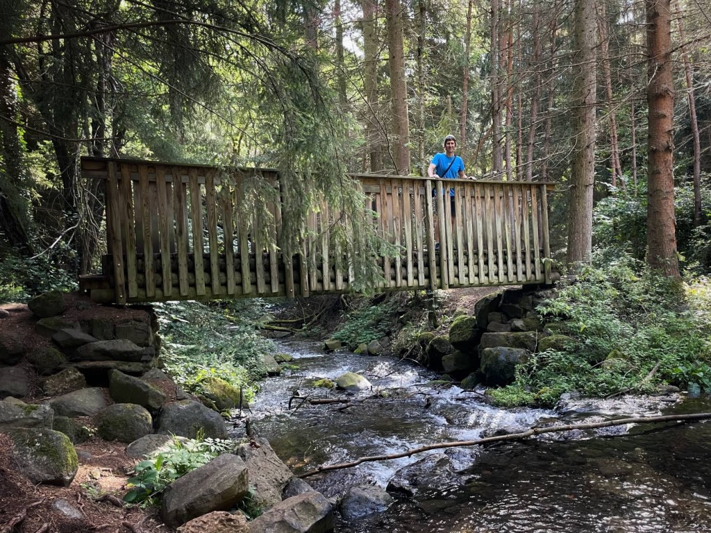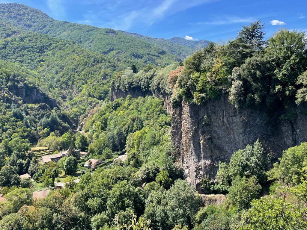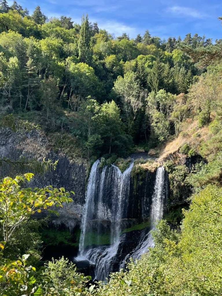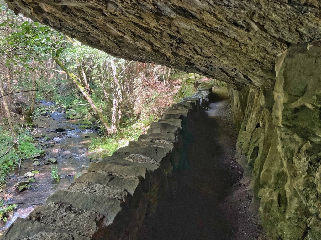 We’ve travelled to Vallon Pont d’Arc today, where we’re staying for a week to do some pack rafting in the Ardèche Gorge. On the way we had a little detour to visit a waterfall, Cascade de la Beaume. It was a lovely walk through woodland, in dappled shade along a babbling brook. The rivers in the area have cut through the volcanic plateau and in places basalt columns can be seen. In one spot on our walk the river has undercut the cliff, which has been shored up with chunks of basalt. We explored the caves above the basalt wall to find a geocache.