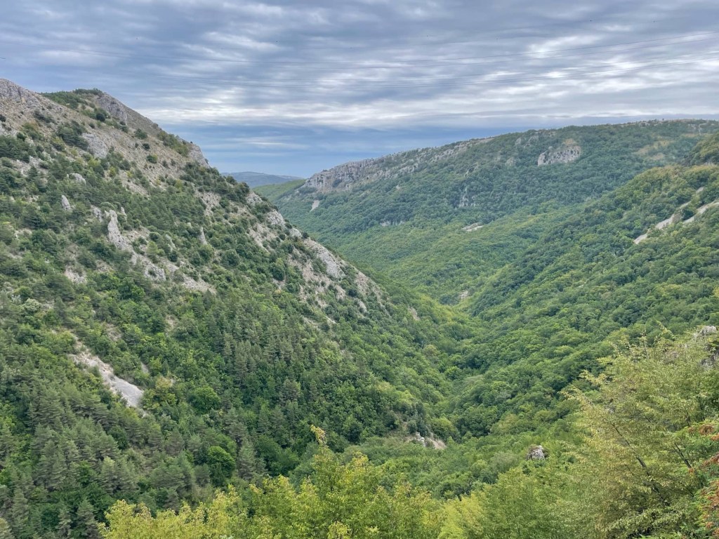 We had tried to go to the LeClerc supermarket in Vence but there was a height barrier so we carried on to the Gorges du Loup. It was a lovely drive between steep sided cliffs, through tunnels and beneath rocky overhangs… no photos though because of the lack of stopping places. We ended up at a village called Gréolières high in the in the Alpes-Maritimes. It was good to be back somewhere peaceful, with very few vehicles on the road, and the scenery was stunning, very green, with lots of trees, and low cloud hanging down the mountains.