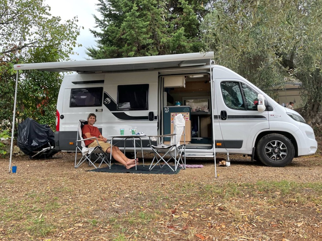 Having filled the fridge and wine drawer, we went back inland to Le Bar-sur-Loup where we’re staying for 2 nights. We had lunch and discussed going to visit the town but, just after we’d set up, the cloud came down and the heavens opened. Time for Plan B number 3! John had a swim in the pool despite the rain then watched rugby in the campsite’s TV room, and I started my jigsaw. It’s been a relaxing afternoon, and still warm, although I did put a long sleeve top on for the first time this month 🙂
