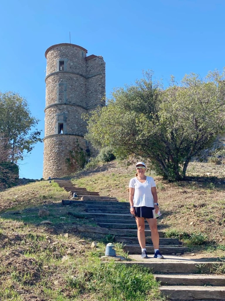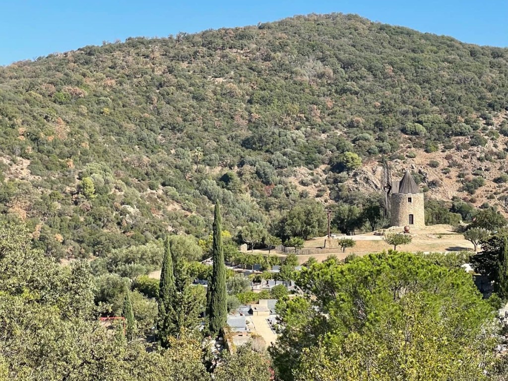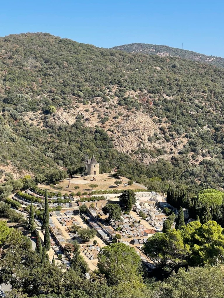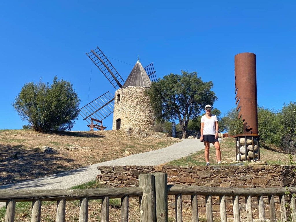 We cycled on quiet, rough tracks… far more pleasant than yesterday’s busy traffic, although Ruby (my bike) and I were bumped around a bit. As we got nearer to Grimaud we could see the ruins of the 11th century castle perched high above us, and the 17th century windmill, Moulin St Roch.