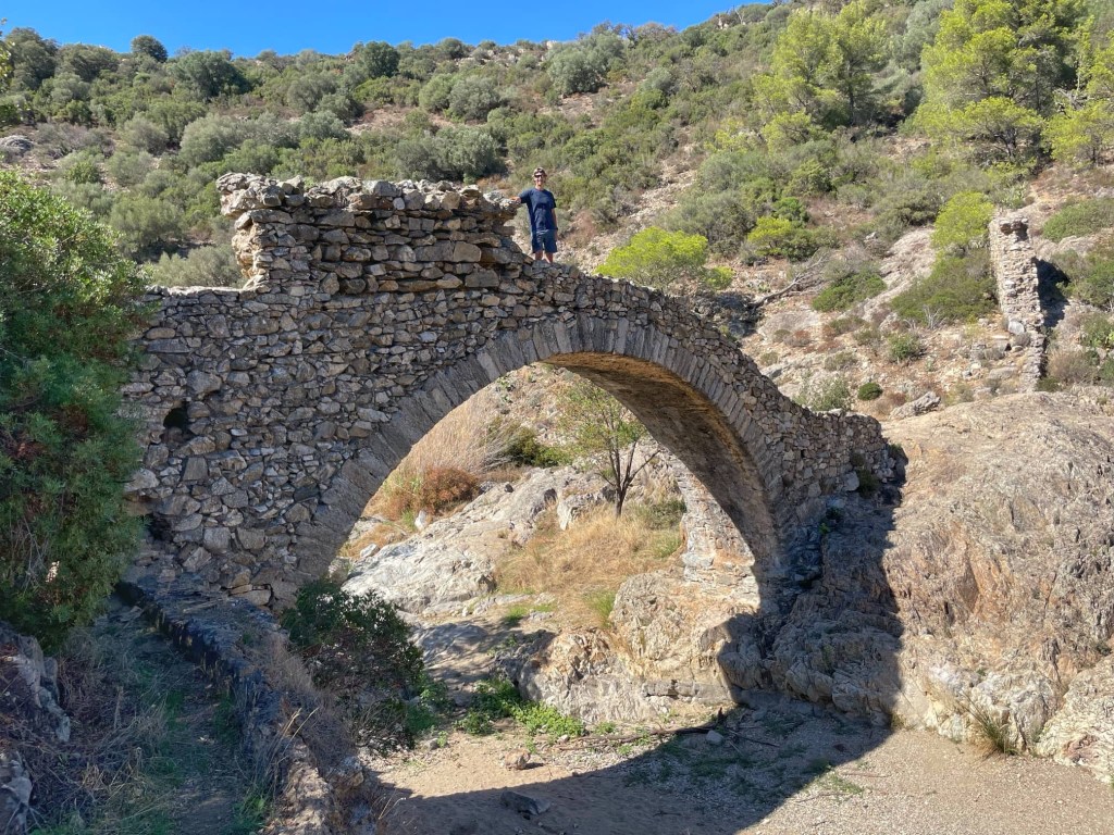 From the mill, we had a walk through the wood, down to the La Garde river valley to see the Pont des Fées or fairy bridge. Unfortunately, although the bridge is very pretty, the river had dried up leaving some stagnant pools only. So much for the photo I’d imagined of a beautiful reflection of the bridge in the water! It was good to see it though, and interesting to read that the pipe in the bridge used to carry drinking water from a spring across the stream to the village in the 16th and 17th centuries.