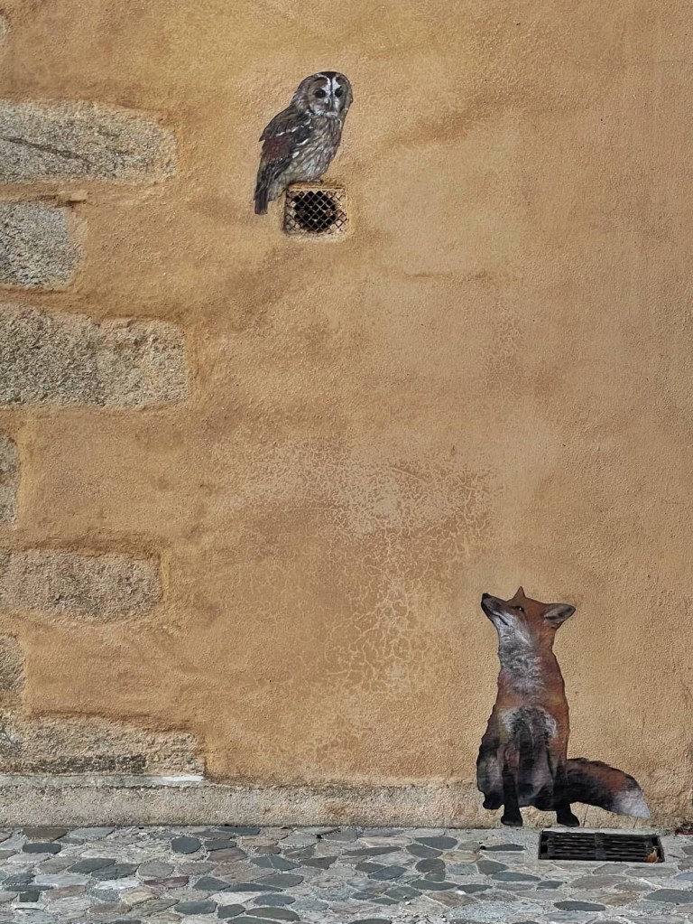 There’s a sculpture exhibition in the village, showcasing the works of 6 artists. John would happily have brought home one of large metal sculptures for our garden! The walls were also painted in places. I like the fox and owl best.