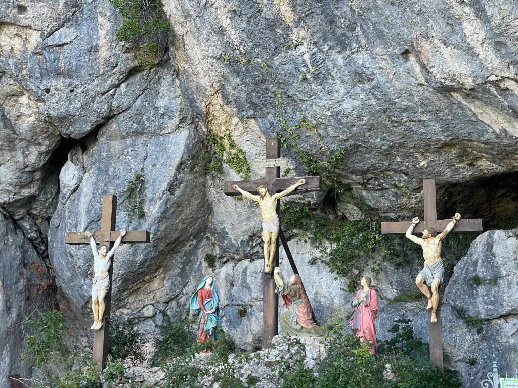 Finally, we came to the path we were taking down from the ridge. On our descent through the trees, we passed a cross, several shrines and a little chapel before we reached the turn off to Mary Magdalene’s grotto. It was a steep climb to this up a track and then 150 steps apparently representing the 150 Ave Marias of the rosary and 150 psalms of David.