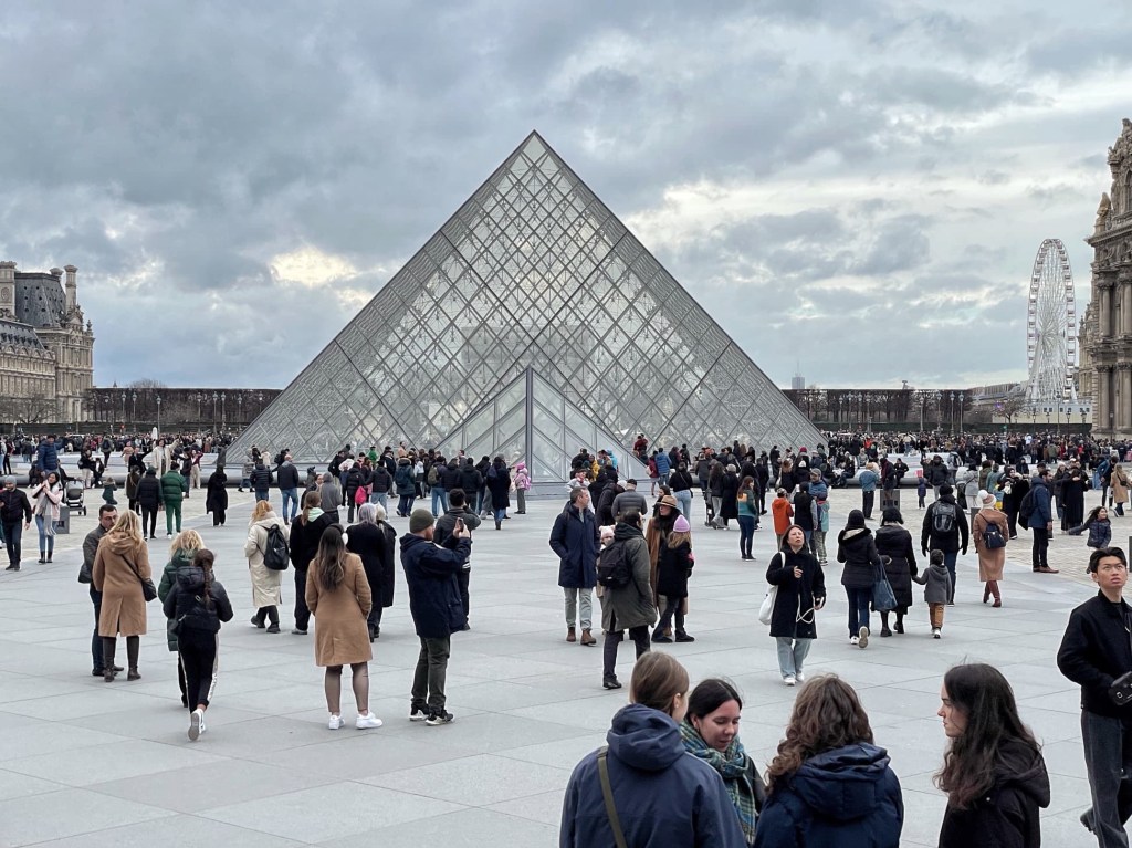 Like all the other tourists, we stopped to take photos of the glass entrance pyramid but, unlike the others, John refused to pose as though his finger was resting on the top point 😆
