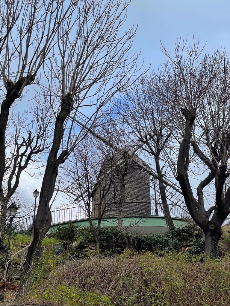 Next we wandered through the narrow back streets and squares of Montmartre past shops selling artisan goods, and a lot more selling tourist tat. Unfortunately, the first windmill we came to was covered in scaffolding, and the second was surrounded by trees.