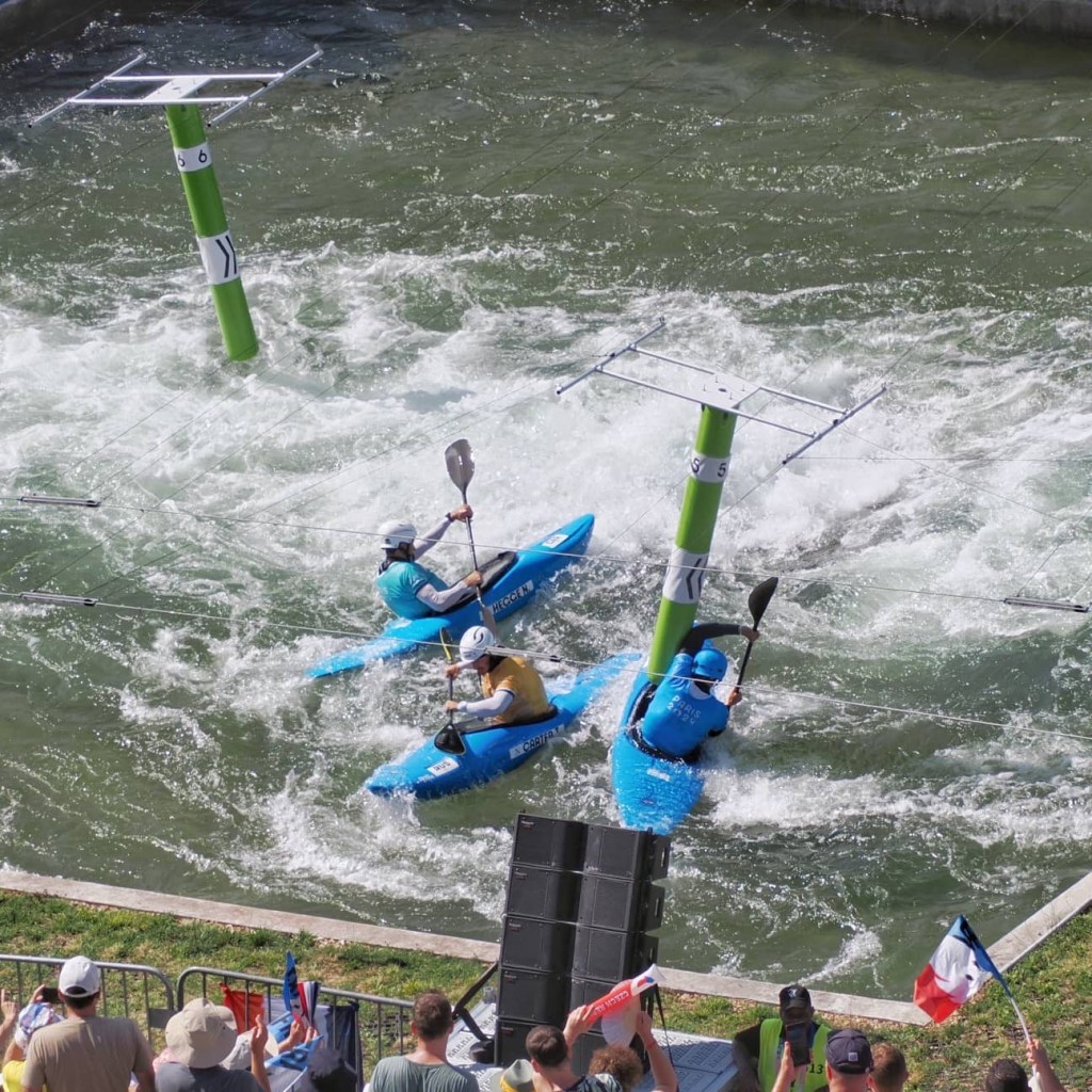 Kayak cross takes place on an artificial white-water course. Four paddlers race simultaneously, having dropped into the water from a 2 metre high ramp when the starting buzzing sounds. They have to roll their kayak then navigate through a series of gates (6 downstream and 2 upstream).