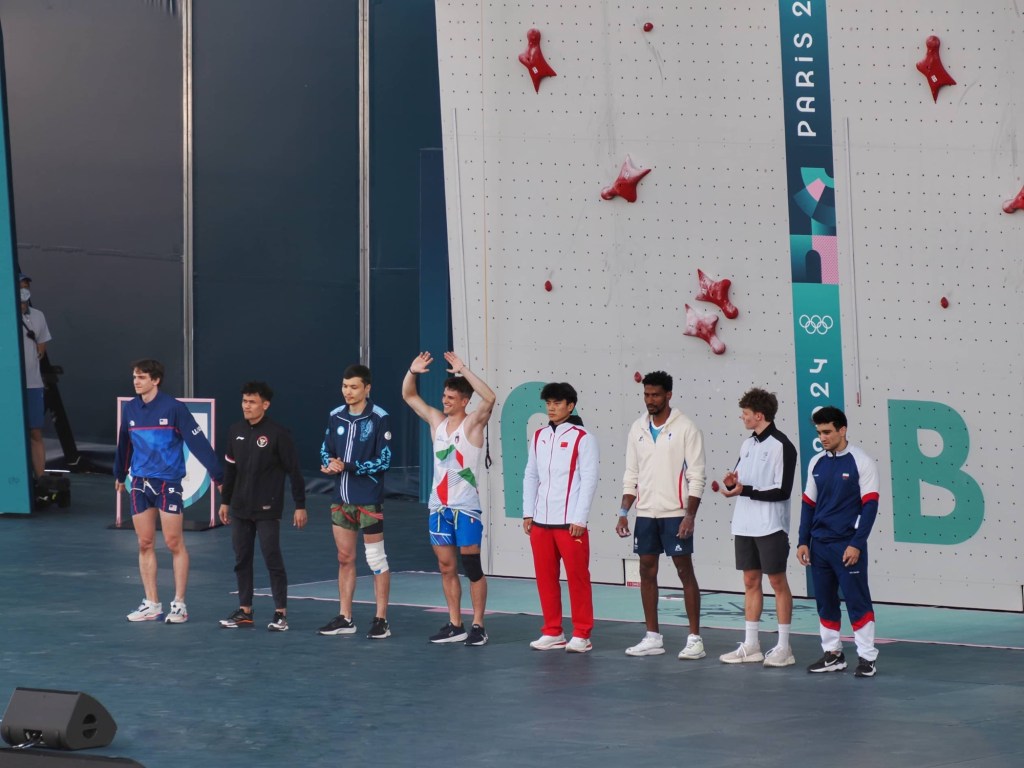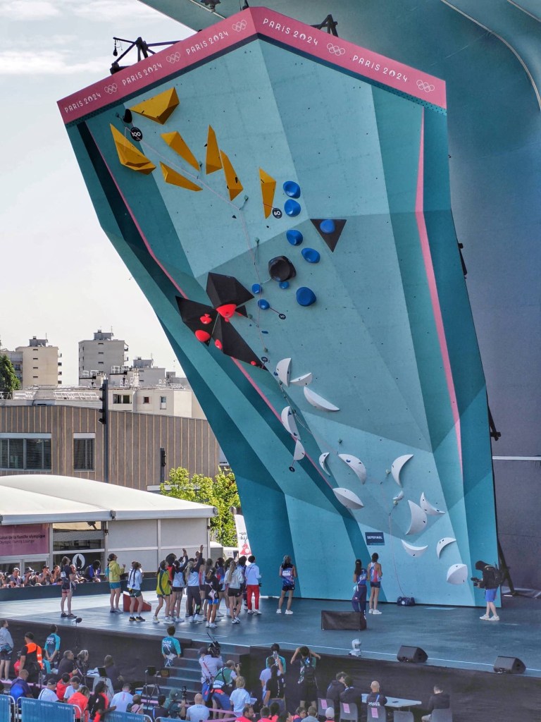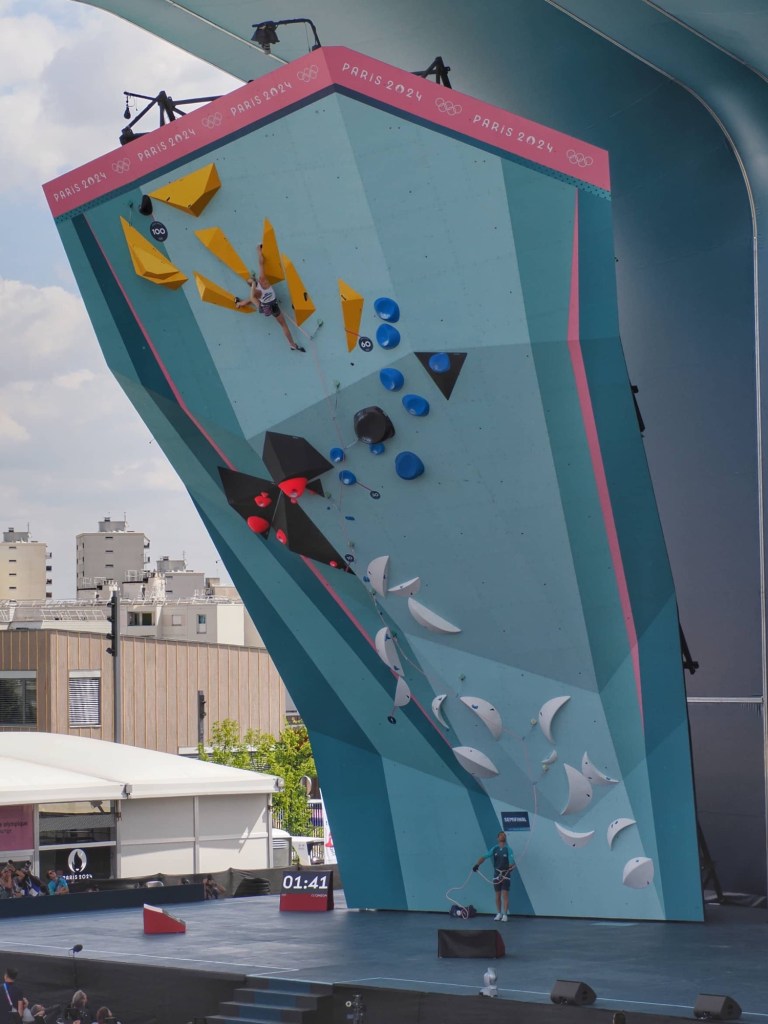 The day’s competitions started with the women’s lead climbing semi-final, in which 20 women took it in turns to try to make it to the top of a wall over 15 metres high, with an overhang, within 6 minutes. Before the start, they were given 6 minutes to look at the wall to consider potential routes. Points were awarded for reaching zones on the wall, with holds that got progressively harder and scored more points, up to a maximum of 100 points.